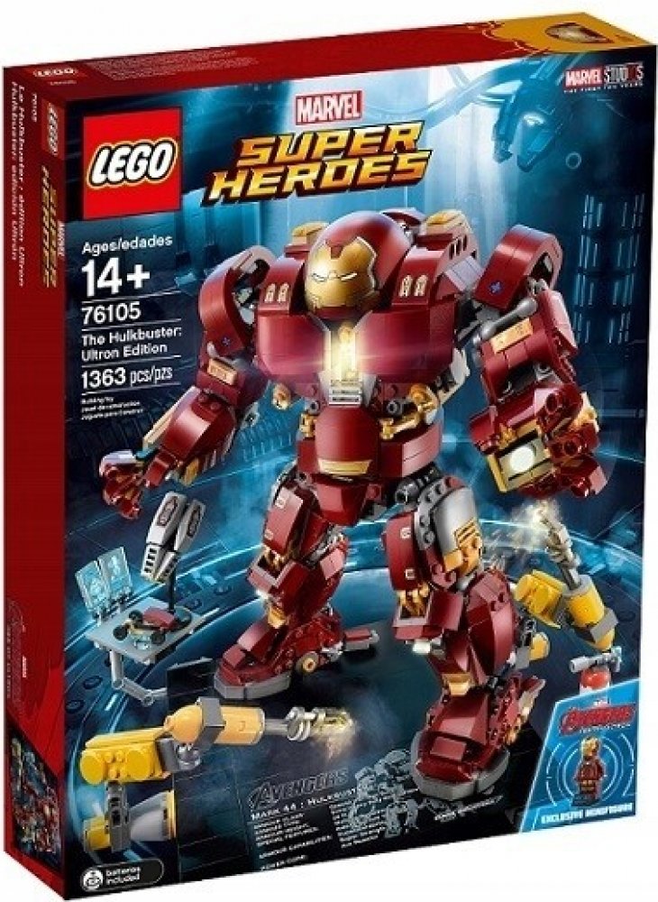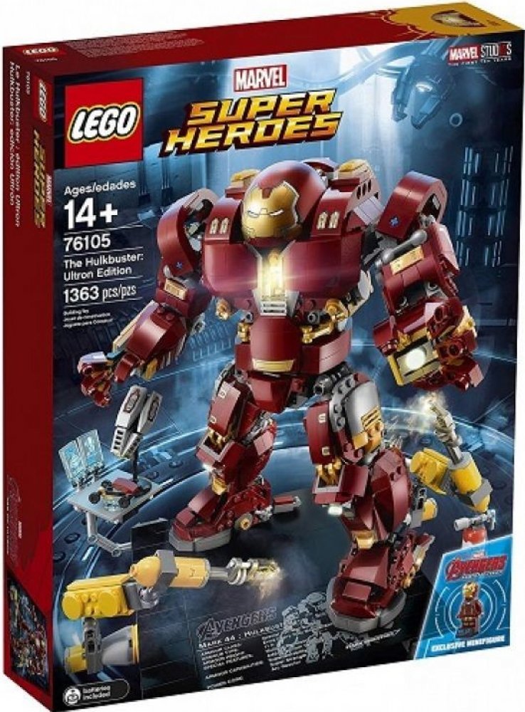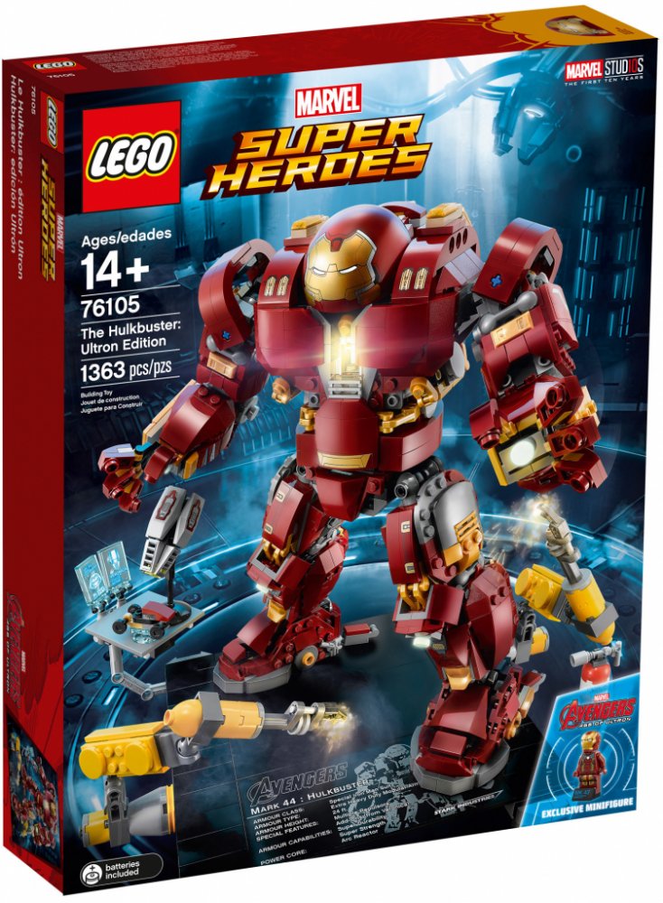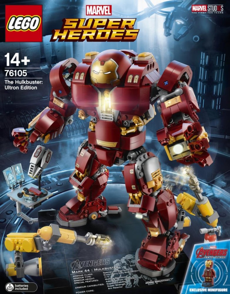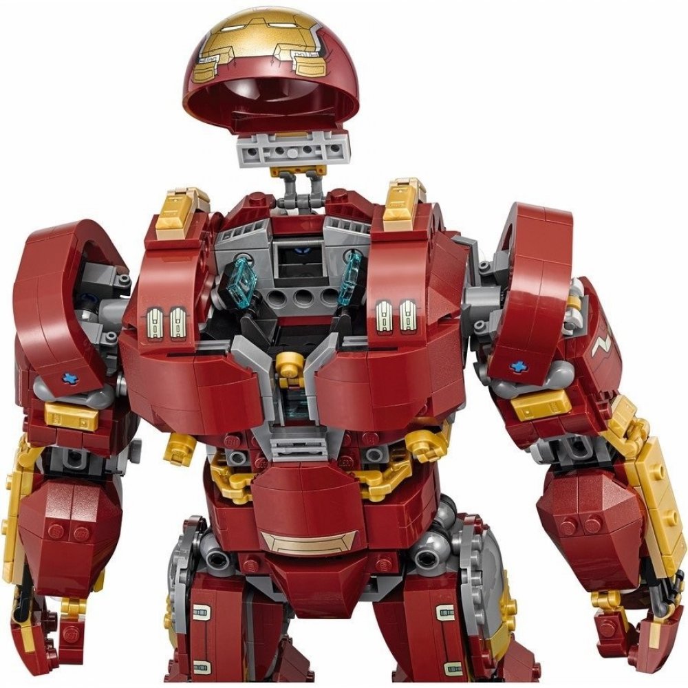 - Hulkbuster má sklápěcí hlavu, otočný trup, ohebné prsty, paže, nohy a chodila, svítící kostku LEGO® na hrudi, 2 vyměnitelné levé paže — obyčejnou paži a paži se sbíječkou a boxovací funkcí a 12 součástek, které svítí ve tmě.