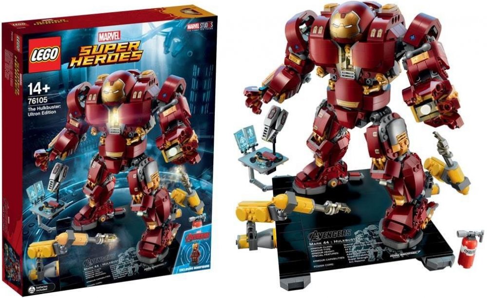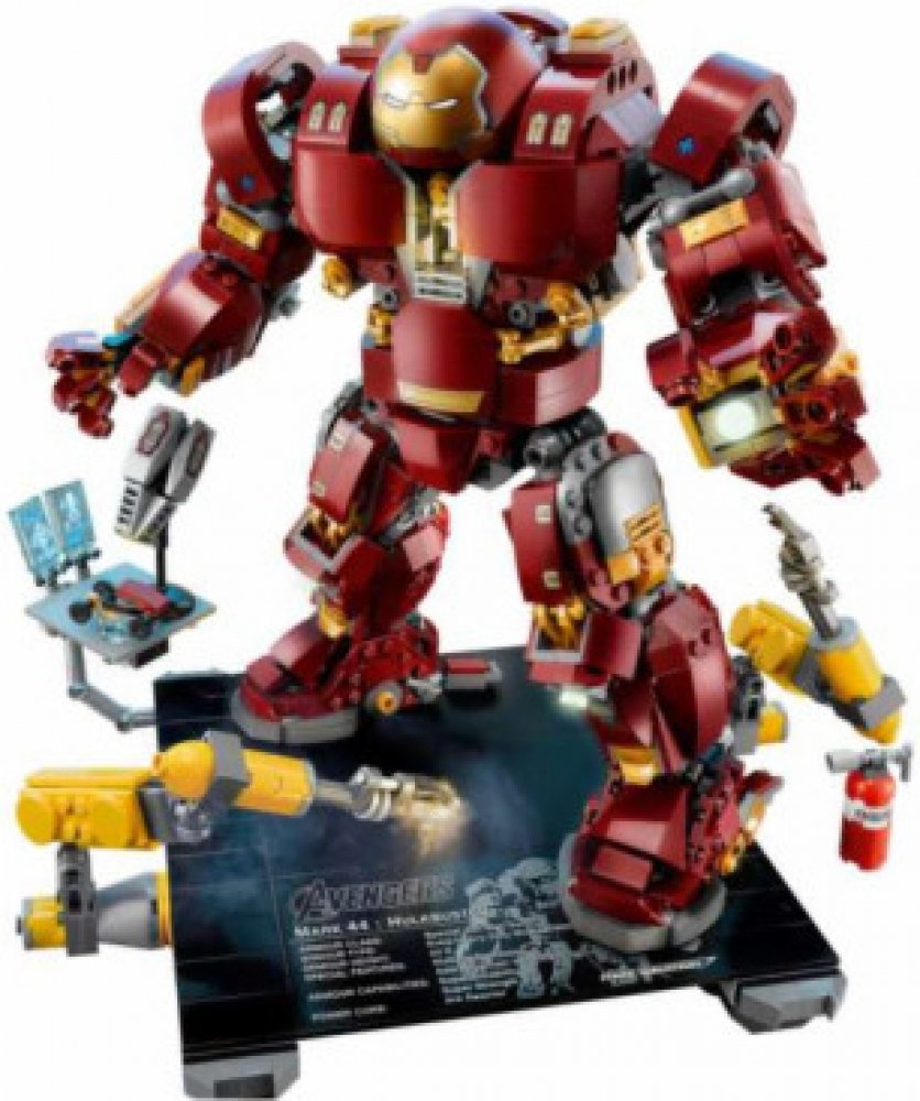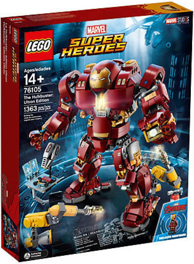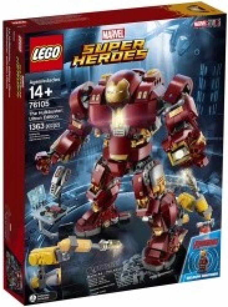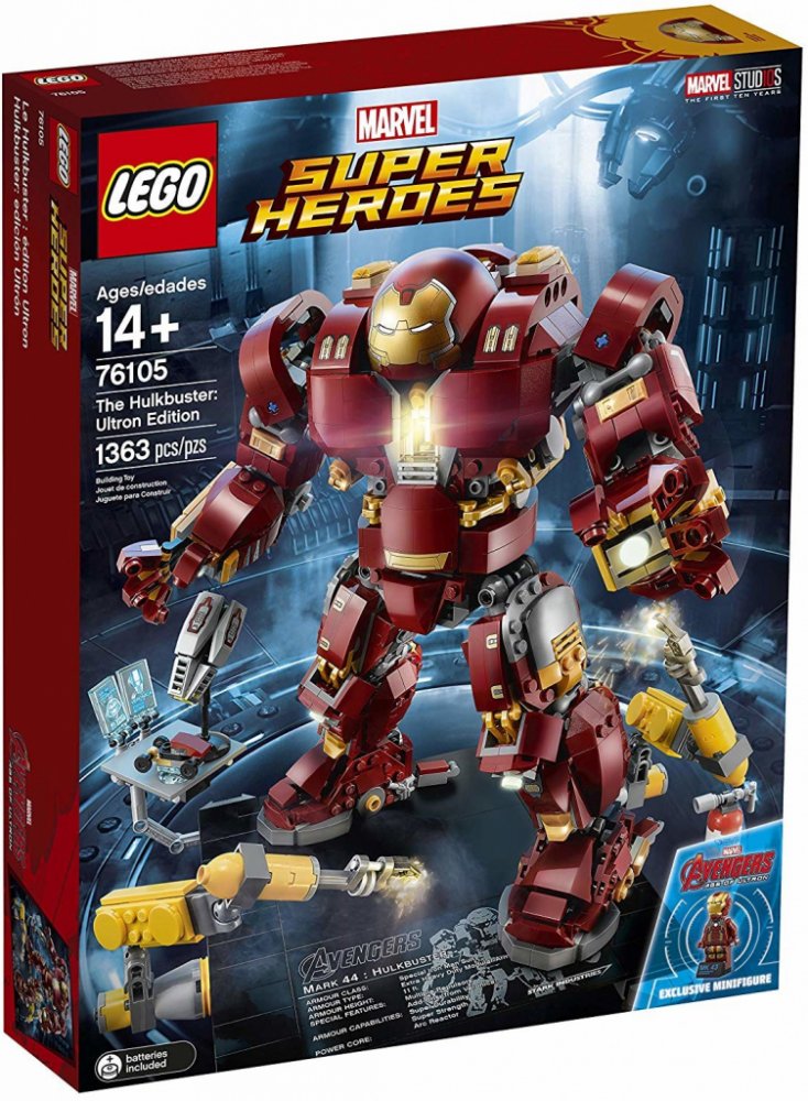 - Hulkbuster má sklápěcí hlavu, otočný trup, ohebné prsty, paže, nohy a chodila, svítící kostku LEGO® na hrudi, 2 vyměnitelné levé paže — obyčejnou paži a paži se sbíječkou a boxovací funkcí a 12 součástek, které svítí ve tmě.