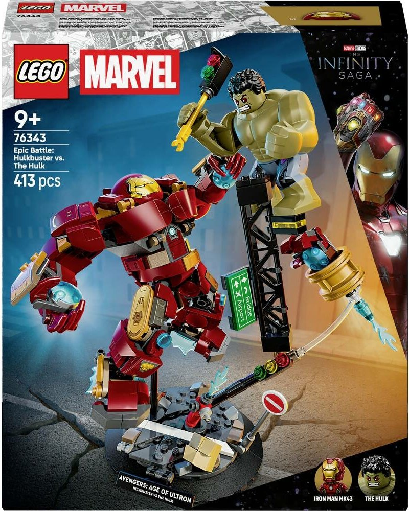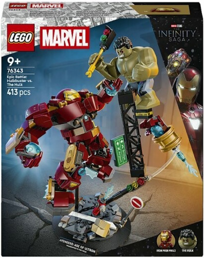 Iron Man bojuje s Hulkem v brnění Hulkbuster uprostřed ulice plné sutin, padajících ocelových konstrukcí a semaforu, který Hulk může použít jako zbraň. Hulkbuster má spoustu kloubů pro maximální pohyblivost. Díky pevné základně a jmenovce můžou děti model použít jako dekoraci pokojíčku nebo odejmout minifigurky a vymyslet si vlastní dobrodružství se superhrdiny. Tato stavebnice představuje skvělý tip na dárek a děti si ji můžou postavit s jistotou díky aplikaci LEGO Builder – přibližujte a otáčejte model ve 3D a sledujte postup pomocí srozumitelného digitálního návodu. Stavebnice obsahuje 413 dílků.