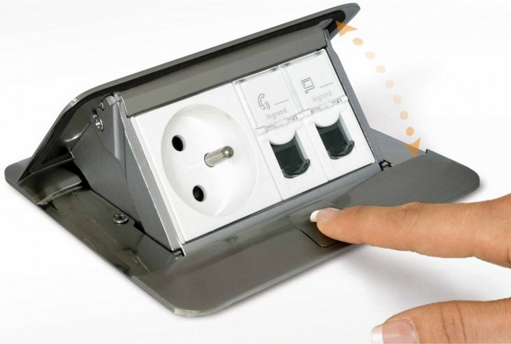 Navržena jako pop-up krabice do podlahy pro nenápadné a prostorově úsporné řešení rozvodů.