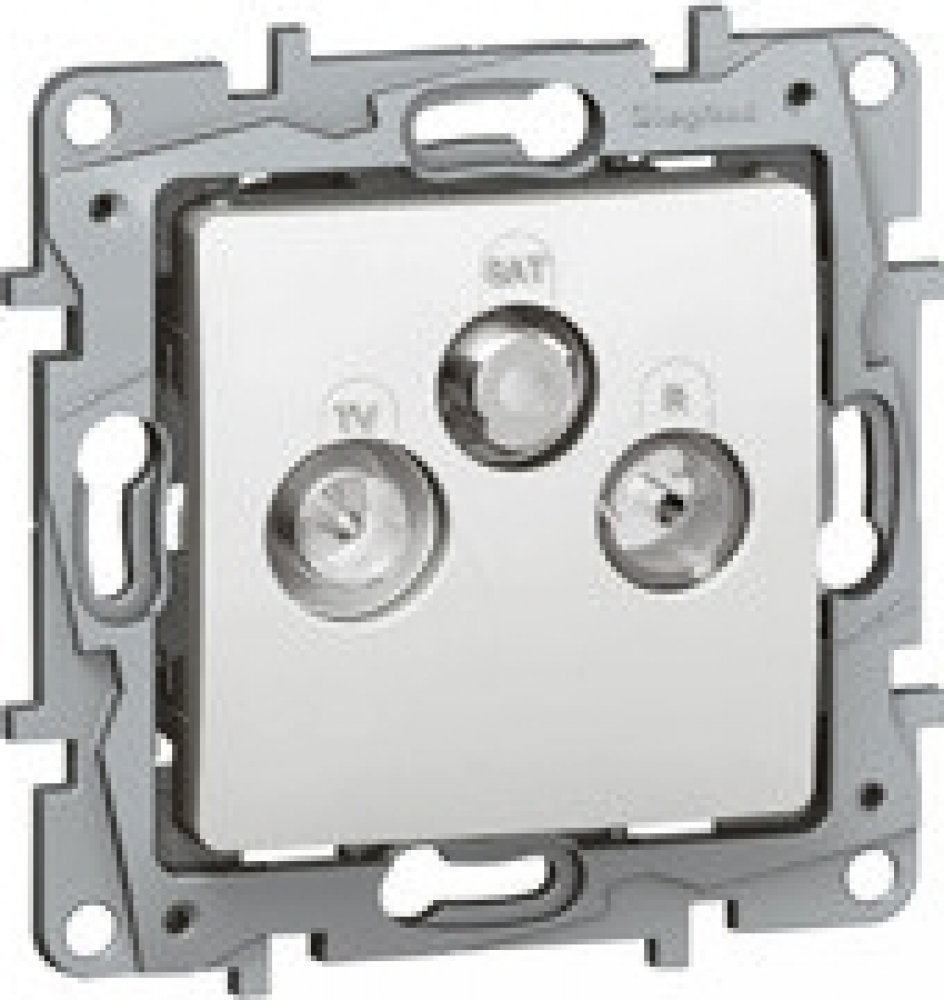 Koncová televizní zásuvka TV+R+SAT Legrand Niloé 764565 v bílé barvě je zásuvkou pro rozvod televizního, satelitního a rádiového vysílání s montáží do elektroinstalační krabice 68. Dodává se bez krycího rámečku, možno dokoupit jednoduchý nebo společný rámeček.