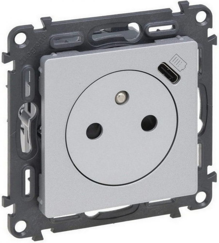 barva: hliníkdesign: Valena Lifekrytí: IP20napětí: 250 V~podsvětlení: neprodejní obal: 1 ksprodukt: zásuvka jednonásobná s ochranným kolíkem a USB-C nabíječkouproud: 16 Aprovedení: FRENCH, USB-C 5 V DC 1,5 A/7,5 Wtyp připojení: automatická svorkaznačka: LEGRANDzpůsob montáže: do krabice
