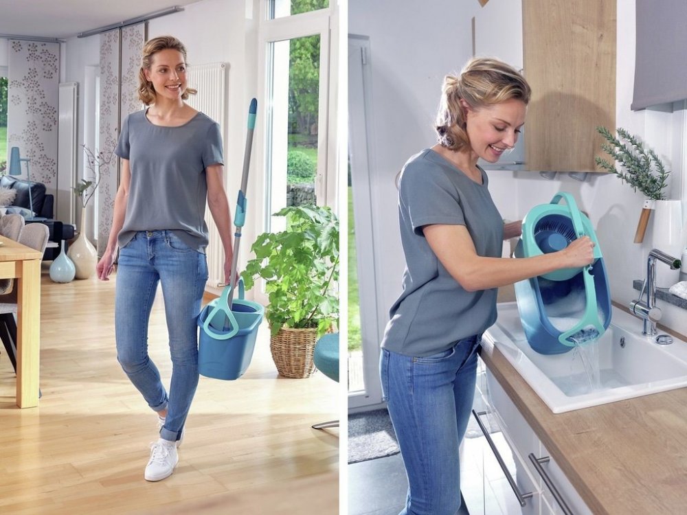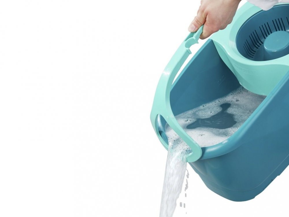 Do vědra napustíte horkou vodu s čistícím prostředkem. Třásně mopu namočíte. Poté mop přesunete do rotační komory, do které hlavice mopu hezky zapadne. Odjistíte tyrkysovou páčku v násadě mopu a opakovanými pohyby násady dolů a nahoru rotační komoru roztočíte. Zatlačením násady dolů proti rotační komoře pak ždímání snadno zastavíte. Poté tyrkysovou páčku opět zajistíte a mop je připraven k úklidu. Úroveň vyždímání volíte podle typu stírané podlahy. Čím déle komora rotuje, tím jsou třásně sušší.