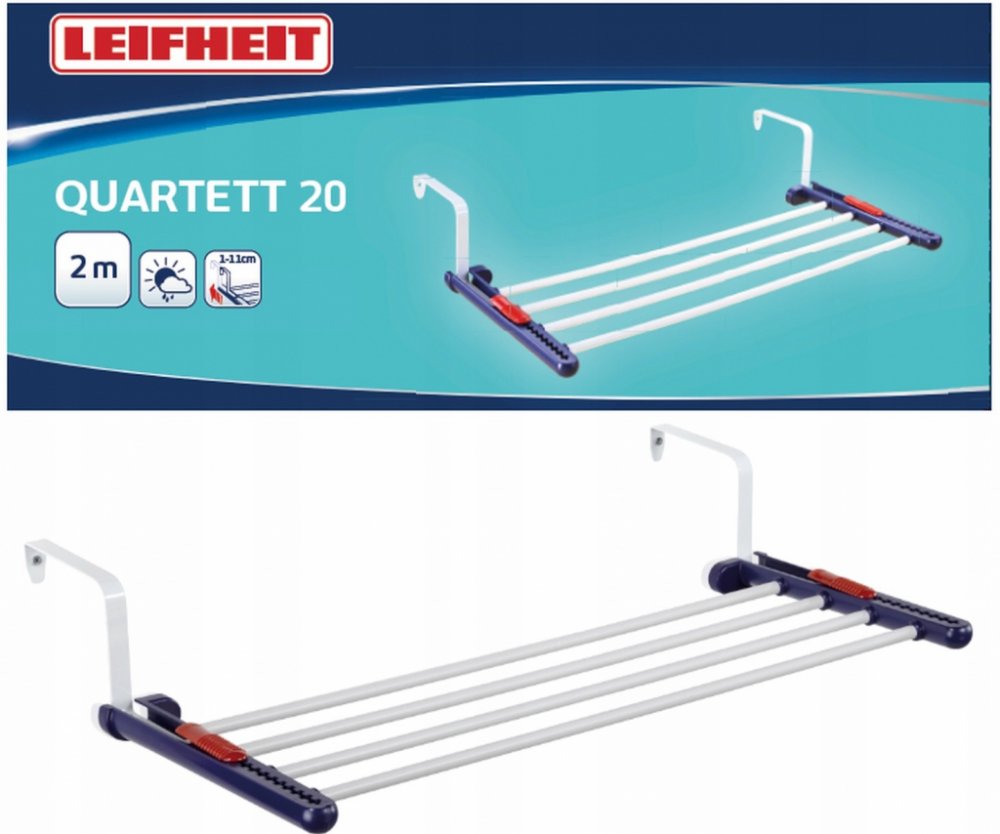 Praktický závěsný sušák na prádlo Quartett značky Leifheit snadno umístíte na topení, okno nebo dveře. Čtyři pevné šnůry, které využijete na sušení několika kousků prádla nebo na každodenní sušení utěrek.