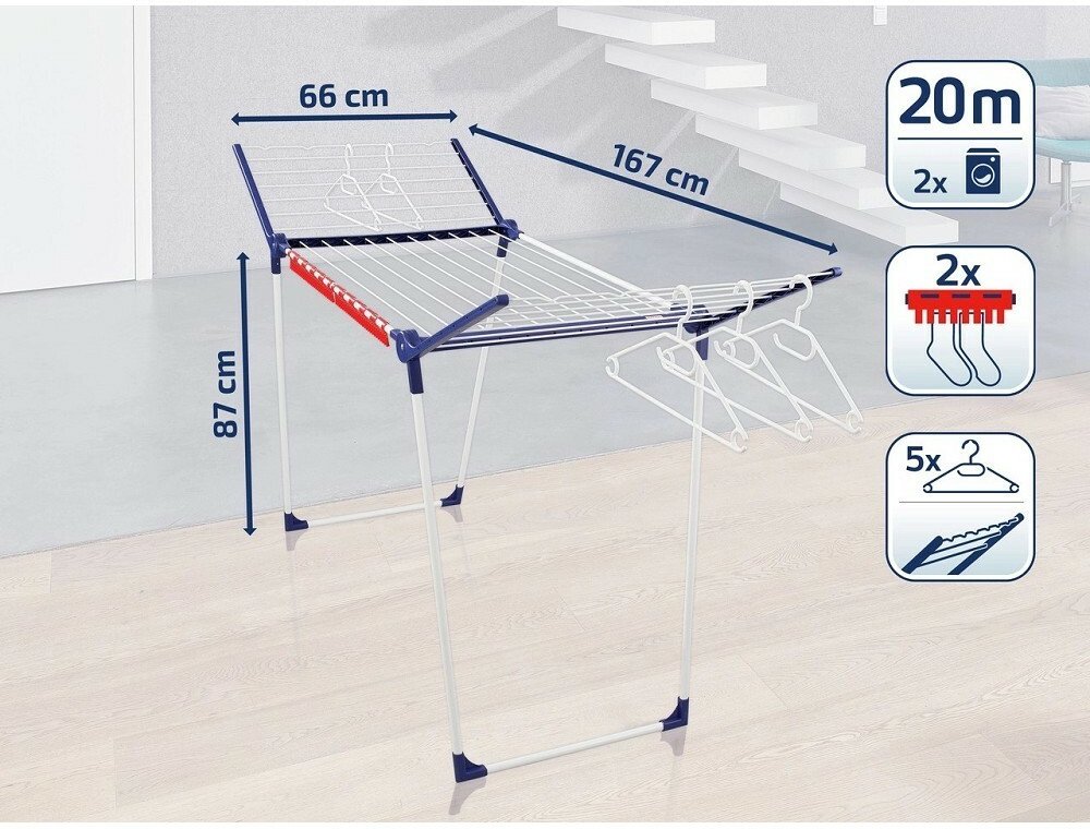 S celkovou sušicí plochou 20 metrů bez problému usušíte až dvě plné pračky prádla. Součástí jsou také 2 EasyClip držáky na drobné kusy prádla a 5 ramínek, která lze zavěsit přímo na rám a ndash; ideální pro košile nebo halenky. Sušák se po použití jednoduše složí a snadno uskladní.