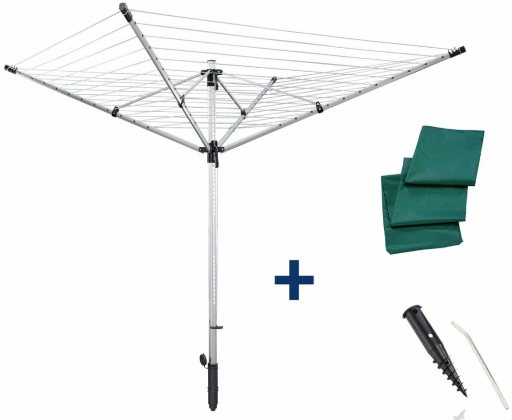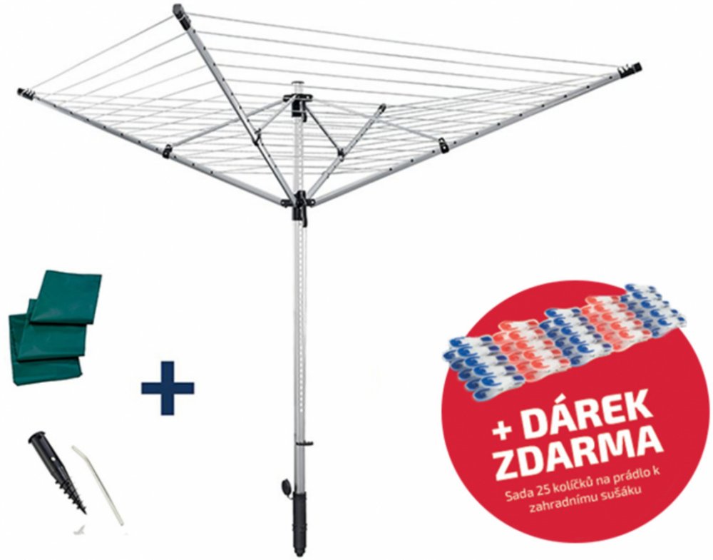 Součástí balení je šroubovací držák, který umožňuje stabilní upevnění sušáku bez nutnosti betonování, a ochranný obal se zipem, který chrání sušák při nepoužívání.