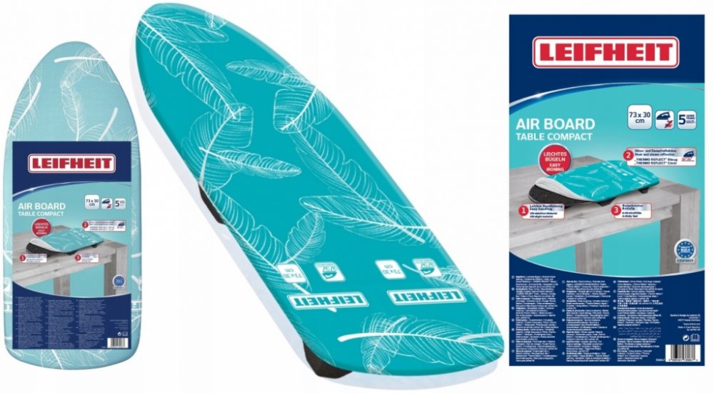 Leifheit Airboard COMPACT Table žehlící deska Lei - Tec o rozměru 73 x 30 cm s technologií Thermo-Reflect, která umožňuje o 33% rychlejší a snazší žehlení. Vybavená protiskluzovými podložkami, díky kterým je stabilní a nepoškodí povrch stolu.