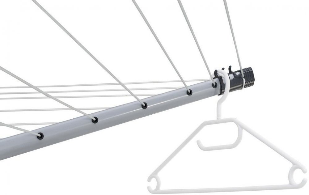 Na každém ramenu sušáku jsou navíc ještě háčky umožňující sušení košile či šatů přímo na ramínku, aniž by hrozilo, že toto ve větru spadne. Celkem lze zavěsit až 12 ramínek.