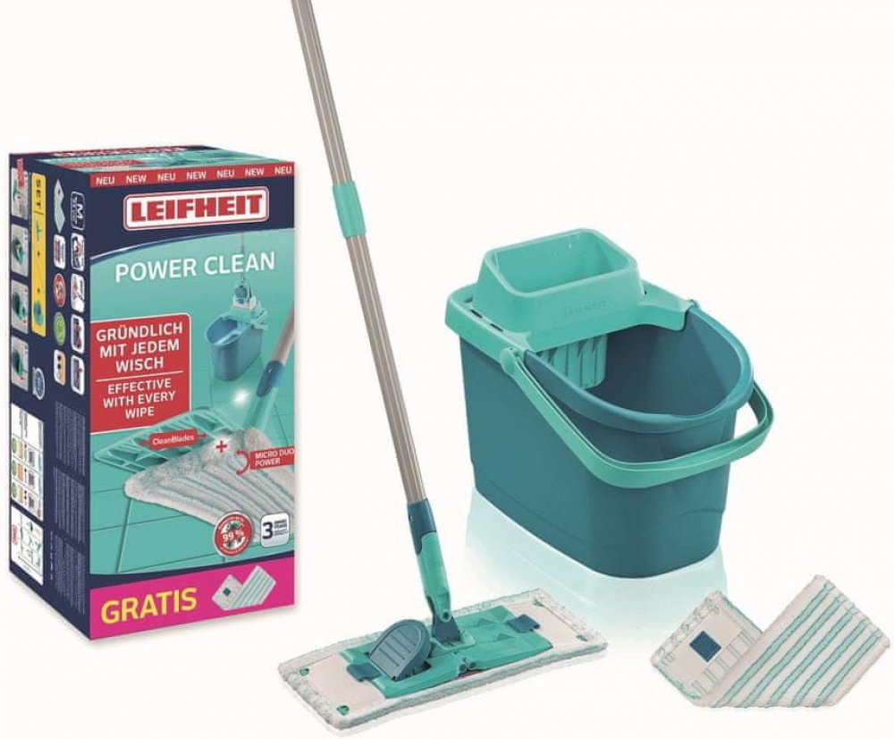 Sada Power Clean M obsahuje: - plochý mop Power Clean M s návlekem Micro Duo - vědro Power Clean M se ždímacím košem Univerzální mopovací systém je nutný zejména tehdy, když je třeba vyčistit různé podlahové povrchy, jako jsou dlaždice nebo laminát. Proto je tady plochý podlahový mop POWER CLEAN M micro duo od Leifheit. Pokud zvolíte všestranný prostředek, můžete vyčistit tvrdé podlahy efektivně a v krátkém čase. Dvouvláknový mopovací návlek Micro Duo pro vlhké čištění podlah bez námahy odstraní i odolné nečistoty a zlikviduje až 99 % virů a bakterií. Návlek lze prát až 200krát v pračce na 60 °C, aniž by došlo ke ztrátě čisticího výkonu. Čisticí sílu podporují také čisticí nože CleanBlades uspořádané za sebou. CleanBlades v mopu na podlahu v kombinaci s návlekem Micro Duo poskytují dokonalé výsledky čištění v krátké době. Podlahový mop POWER CLEAN M Micro Duo od Leifheit je navíc vybaven masivní ocelovou rukojetí, která umožňuje výkonné vytírání a podporuje flexibilní čištění do osmiček díky plochému otočnému kloubu o 360°. S mopem se snadno dostanete i do těžko přístupných míst. Šířka stírání 33 cm umožňuje rychlý úklid velkých podlahových ploch. Mop má celkovou pracovní délku 150 cm, takže úklid probíhá ve vzpřímené poloze a bez ohýbání. Díky patentovanému odjišťovacímu mechanismu lze základní desku odemknout ve stoje pomocí velkého nožního tlačítka. Velké množství čisticí vody je zvláště výhodné, když je třeba vyčistit velké podlahové plochy. S kapacitou 10 litrů poskytuje úklidové vědro z řady POWER CLEAN M velké množství vody i po opakovaném ždímání. Stačí jedno naplnění vodou, aniž byste jej museli neustále doplňovat. V kombinaci se ždímacím košem POWER CLEAN od Leifheit vzniká praktický mopovací systém, který umožňuje vytírat a vyždímat potah mopu, aniž byste se museli ohýbat nebo máčet ruce ve špinavé vodě. S připojeným ždímacím košem POWER CLEAN má vědro POWER CLEAN M využitelný plnicí objem 6 litrů. Aby bylo možné úklidové vědro vyprázdnit kontrolovaně a bez rozlití, má vylévací otvor a praktické zapuštěné úchyty. Díky ergonomické rukojeti se také pohodlně nosí, i když je plné. Díky kompaktnímu designu se hodí pro většinu podlahových mopů a po úklidu se snadno skladuje. Nově vyvinutá konstrukce ždímacího koše zajišťuje o 18 % lepší ždímání v porovnání se systémem Leifheit Combi. Díky tomu lze vhodnou zbytkovou vlhkost v návleku mopu určit během okamžiku pro jakýkoli typ podlahy, ať už je to dlažba nebo laminát. Šikmý otvor koše zajišťuje obzvlášť příjemné používání bez rozlití. Instalace ždímacího koše Leifheit POWER CLEAN M je také snadná: nasaďte je, zaklapněte a můžete začít vytírat. Ždímací koš Leifheit sedí stabilně na čisticím kbelíku a lze jej také snadno znovu vyjmout.