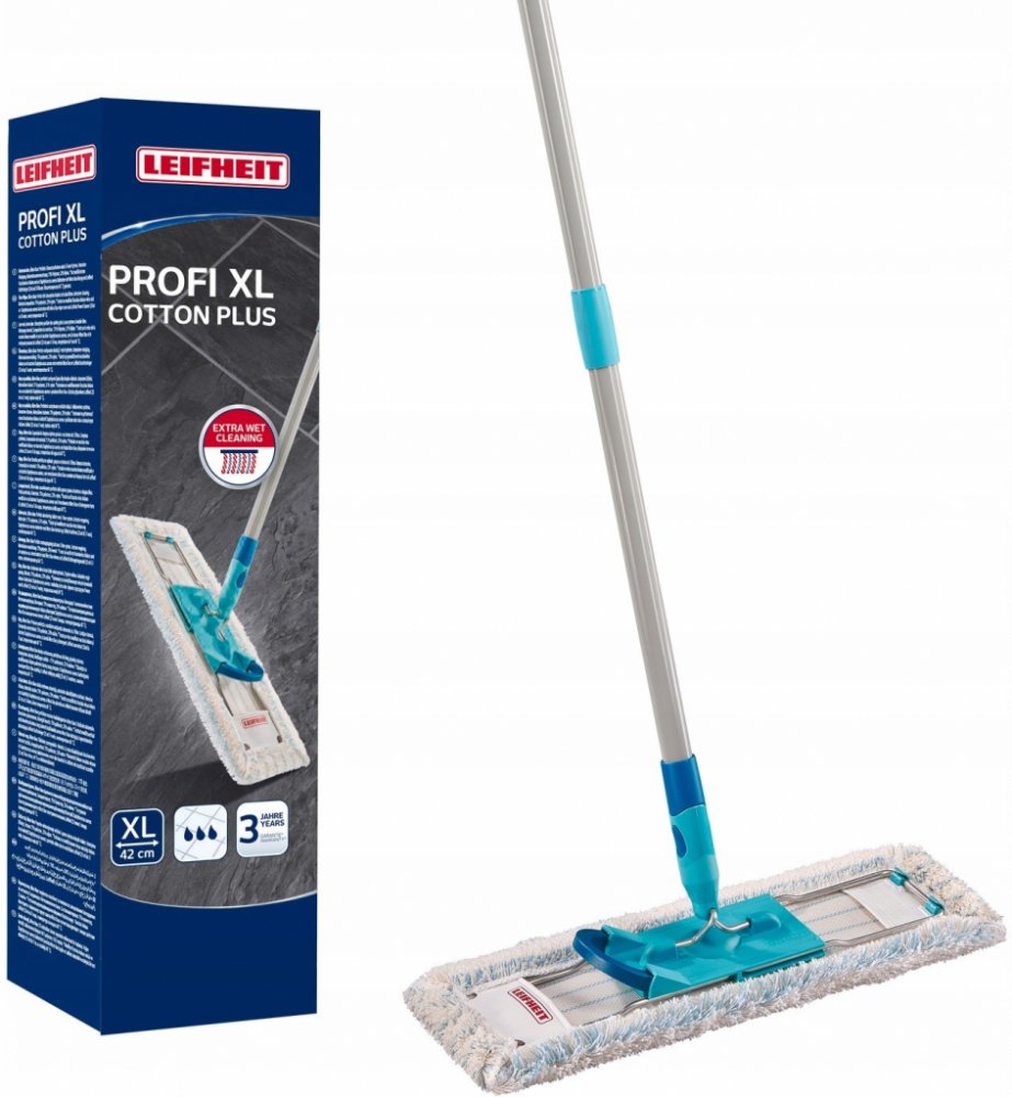 Ideální mop pro velké plochy: díky speciálnímu nástavci ze dvou typů vláken mop Profi XL značky Leifheit odstraňuje až 99 % virů a bakterií* a umožňuje pohodlnou manipulaci s nohou. Tenké, trochu delší štětiny snadno odstraní i odolnou špínu z těch nejmenších prohlubní. Návlek lze prát v pračce na tempo. 60 °C až 400krát bez ztráty čisticích vlastností. 360° otočný kloub umožňuje efektivní mytí cikcakem a šířka mopu – 42 cm – ušetří námahu a čas. Tyč umožňuje práci v libovolném úhlu. K dostání samostatně: kbelík se ždímačem na mop Profi XL nebo kbelík se ždímačem na mop Profi Compact pro snadné ždímání návleku, aniž byste museli namáčet ruce ve špinavé vodě. * Testováno na modifikovaném kravském viru Ankara a bakteriích zlatého stafylokoku pomocí překrytí micro duo a vody (teplota vody 35˚C).
