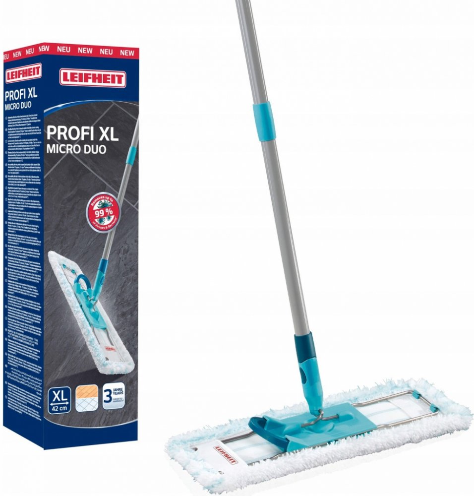 Už žádné bolesti zad při úklidu a nevzhledné šmouhy na podlaze. Díky speciálnímu nástavci ze dvou typů vláken mop Profi XL s nástavcem micro duo značky Leifheit odstraňuje až 99 % virů a bakterií* a umožňuje pohodlnou manipulaci s nohou. Takto vypadá ideální mop pro velké plochy, např. v kuchyni nebo v pokojích. Návlek vyrobený ze dvou typů vláken obsahuje osvědčené mikrovlákno Duo od značky Leifheit, které se skvěle hodí pro mytí všech typů podlah. Tenké, trochu delší štětiny snadno odstraní i odolnou špínu z těch nejmenších prohlubní. Návlek lze prát v pračce na tempo. 60 °C až 400krát bez ztráty čisticích vlastností. Velká šířka návleku na mop Profi – 42 cm – vám ušetří námahu a spoustu drahocenného času. Brilantní 360° otočný kloub umožňuje efektivní mytí cikcakem a kolem nohou stolů a skříní. Tyč umožňuje práci v libovolném úhlu a tím i umytí těžko přístupných míst pod skříněmi a postelemi. Mopa lze používat v pohodlné poloze ve stoje: stačí sejmout nástavec stisknutím nohy na západku, vyždímat jej v samostatně přístupném kbelíku se ždímačem na mop Profi XL značky Leifheit, znovu jej nasadit a je hotovo. * Testováno na modifikovaném kravském viru Ankara a bakteriích zlatého stafylokoku pomocí překrytí micro duo a vody (teplota vody 35˚C).
