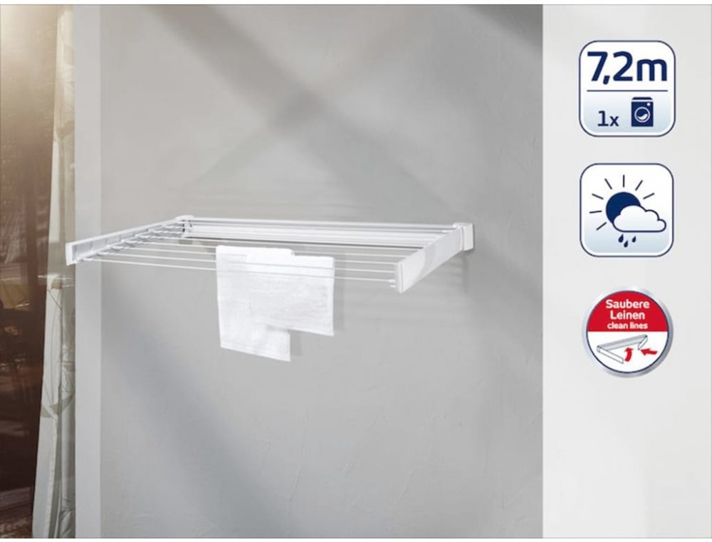 Tento nástěnný stojan na sušení prádla má osm tyčí o délce na sušení přibližně 7,2 metru. Sušicí tyče mají uzavíratelný design, takže při instalaci venku budou chráněné před nečistotami a deštěm. Pokud je chcete otevřít, jednoduše rozložte obě křídla a robustní, práškově lakované tyče na sušení jsou připravené k použití.