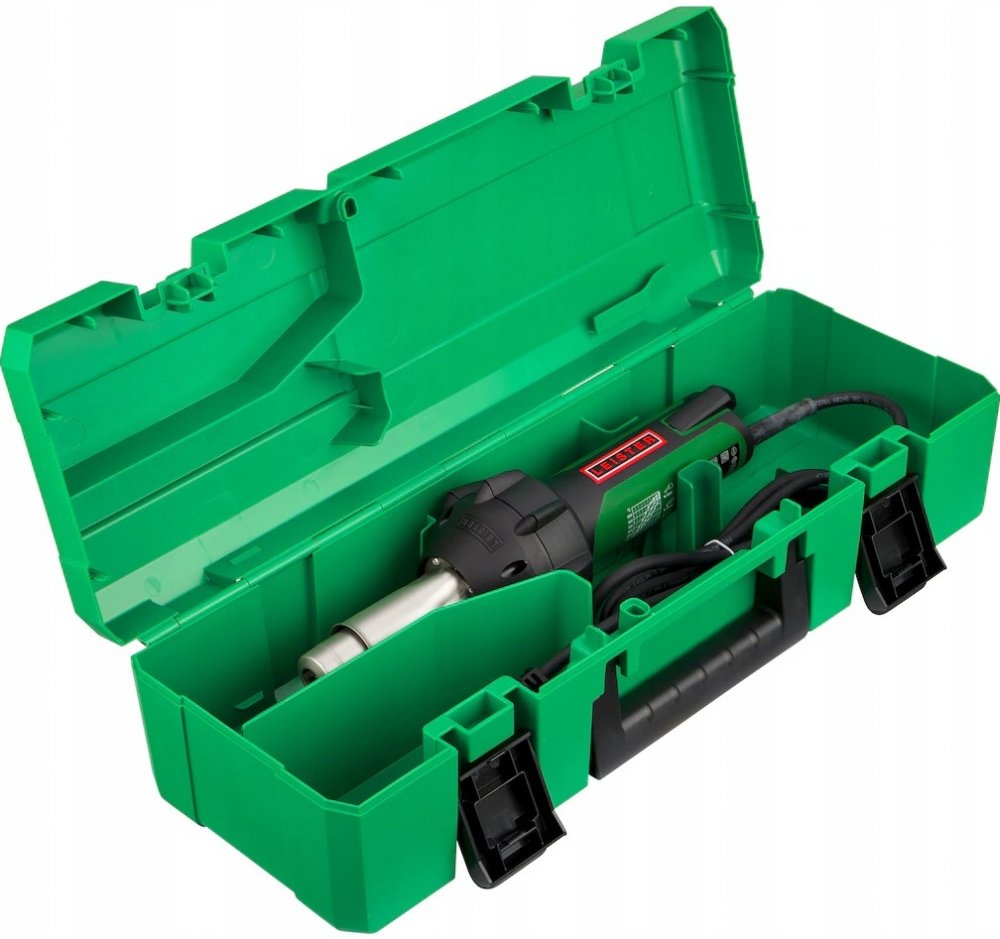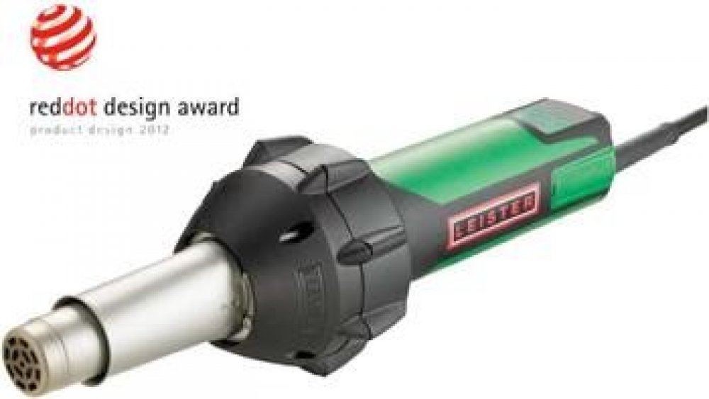 Leister Triac AT s LCD displejem v sadě s tryskou o šířce 40 mm, tryskou o šířce 20 mm, mosazným válečkem, testerem/zkoušečkou svařování Leister a silikonovým válečkem Leister o šířce 40 mm, kartáčem z měkkých štětin pro čištění trysky a německými průmyslovými nůžkami.