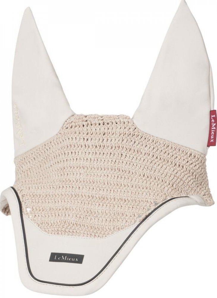 Ručně háčkovaná čabraka na uši LeMieux Essence z kolekce jaro/léto 2025. Ouška a vsuvka jsou vyrobeny z jemného softshell materiálu, bavlněné háčkování. Očko na spodní straně pro případné uchycení k uzdečce. Silikonový potisk loga a kontrastní paspulka.