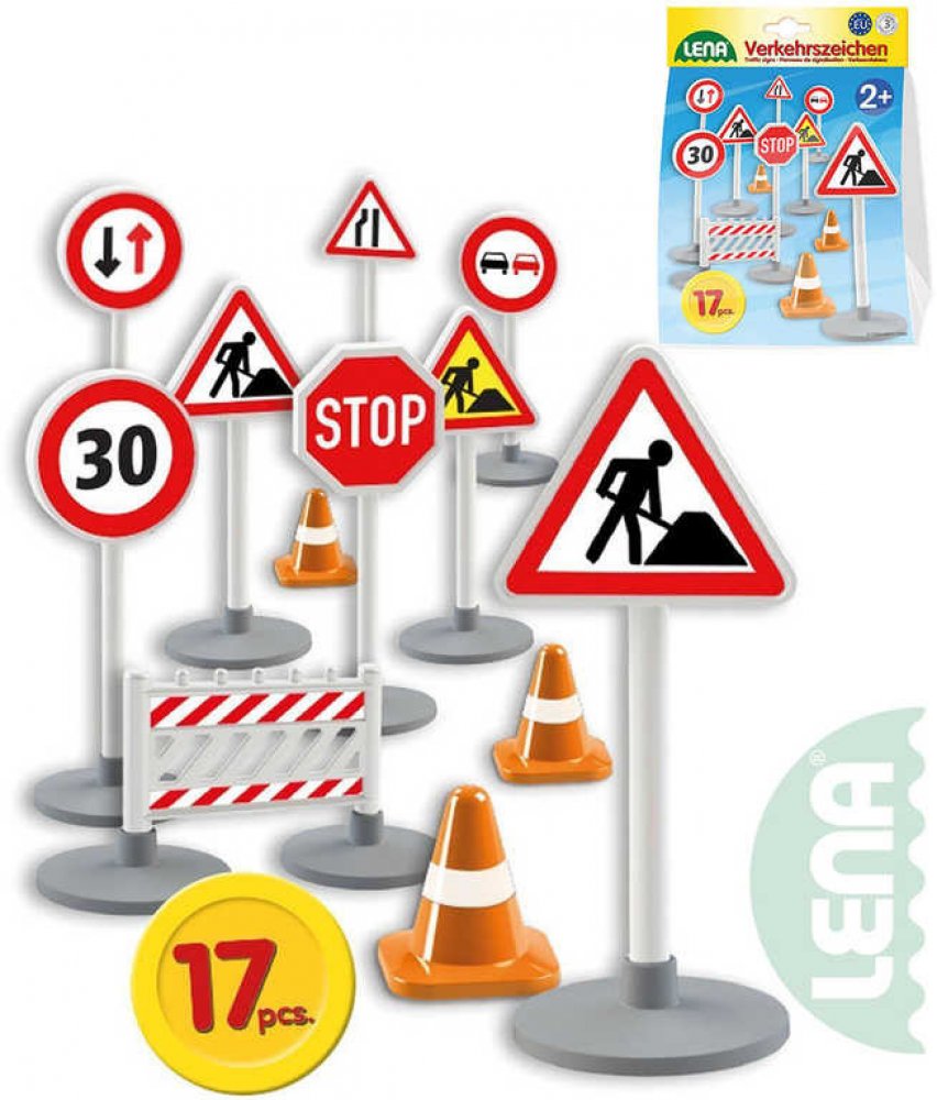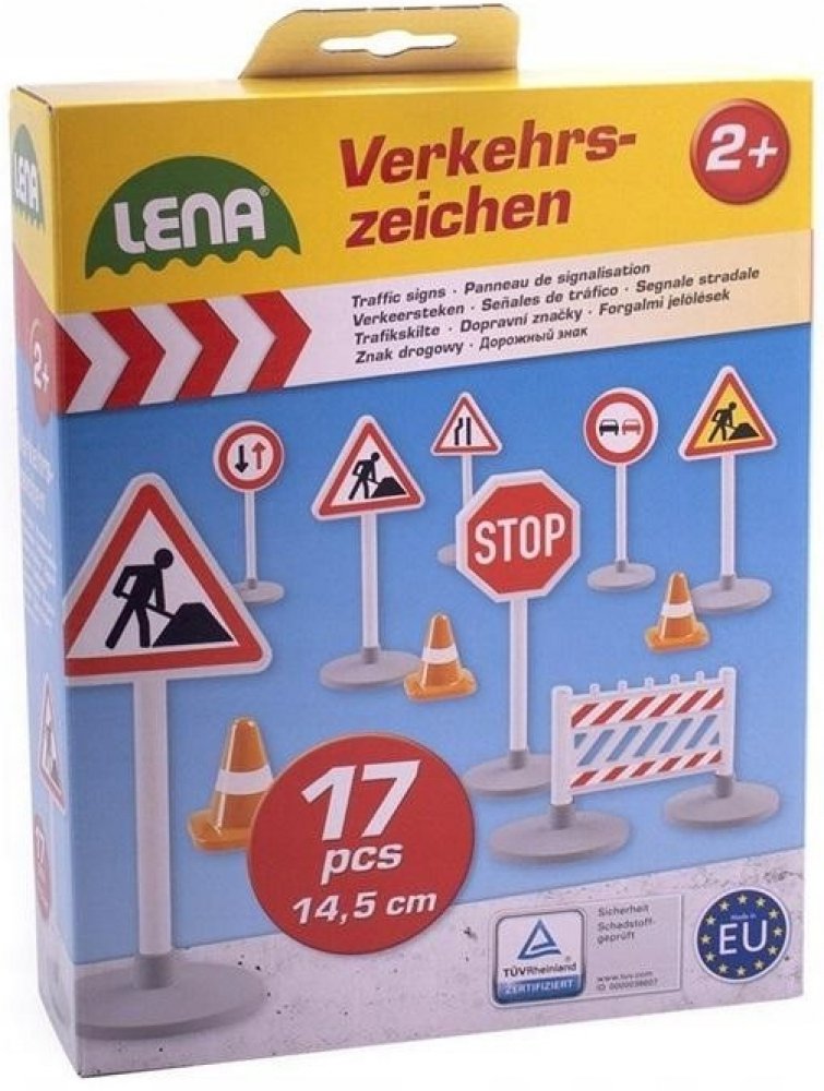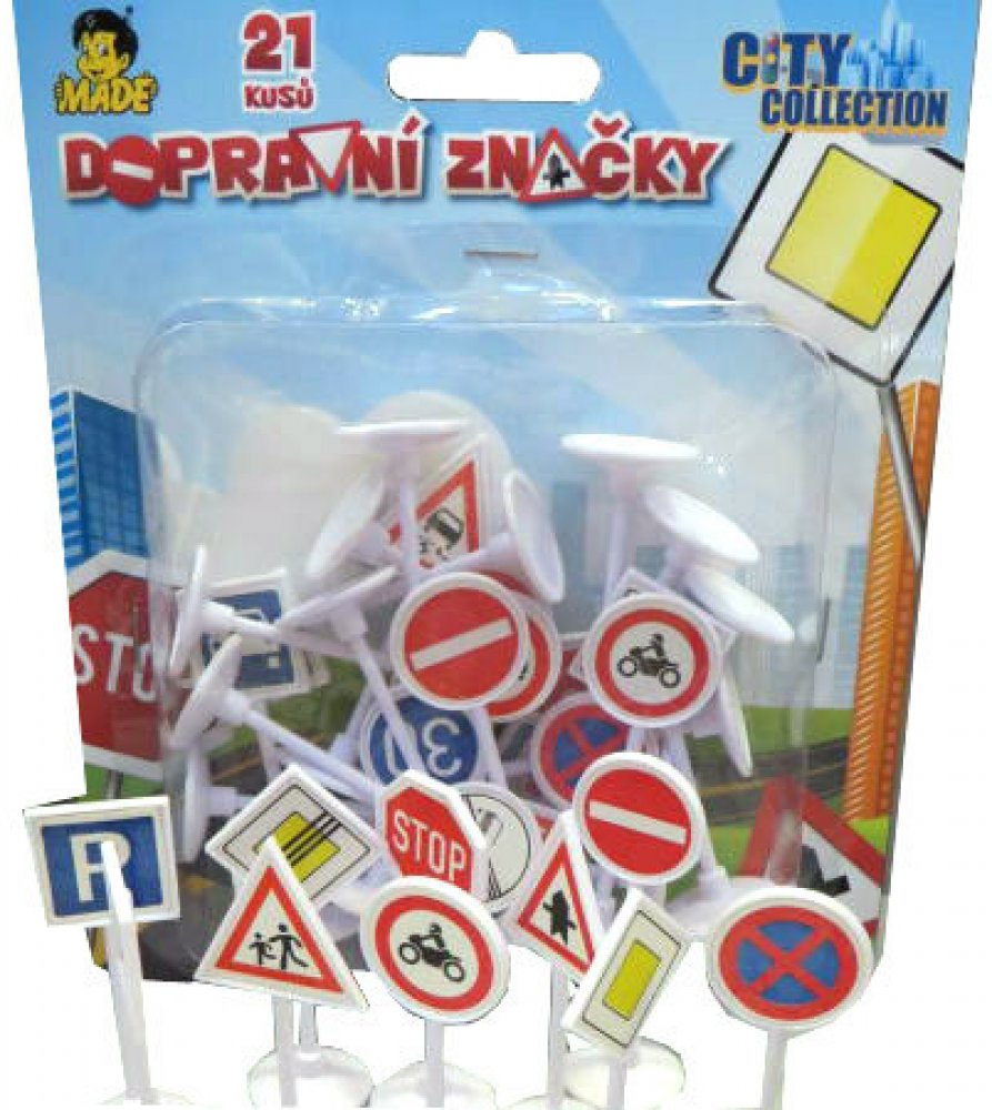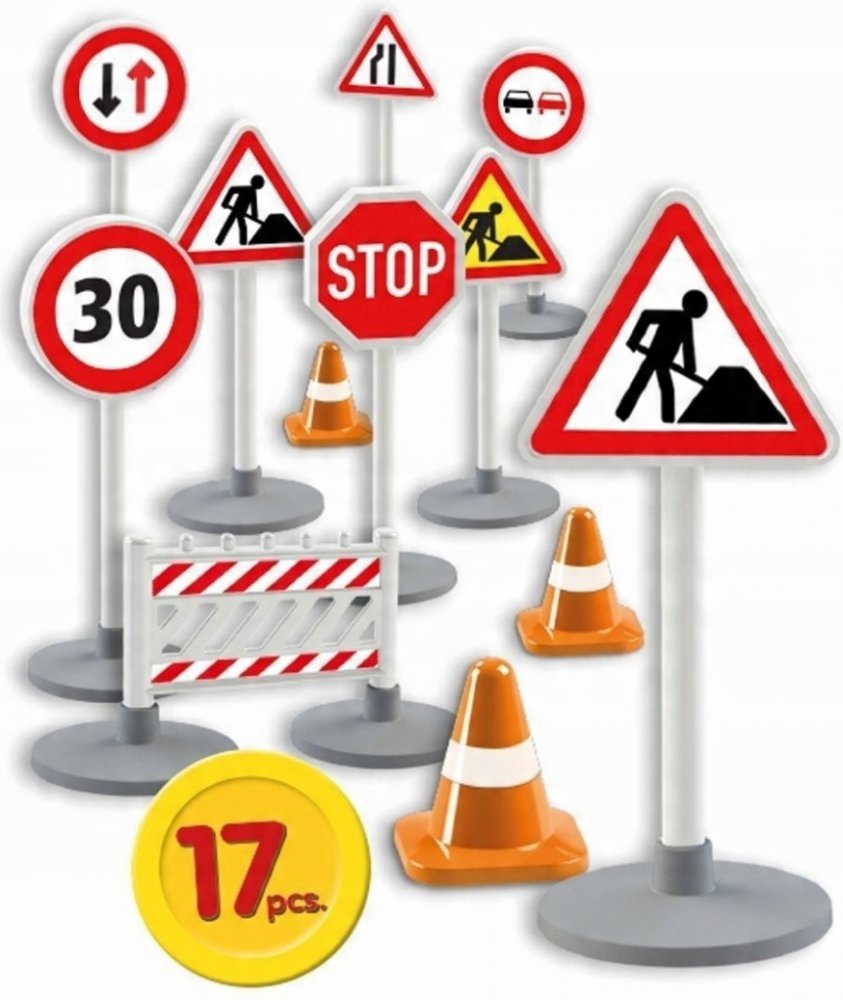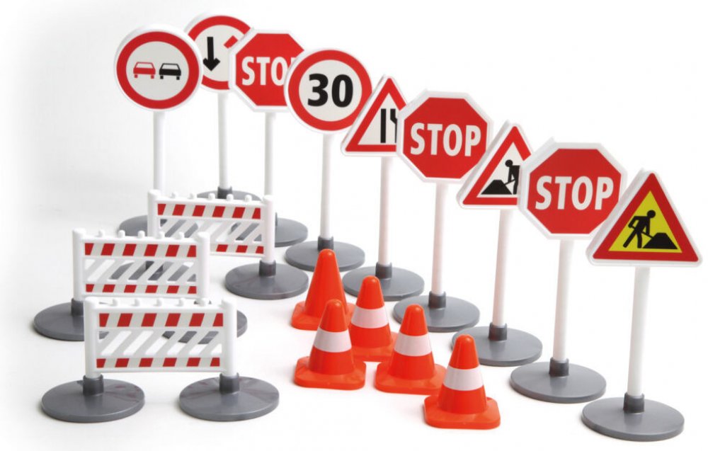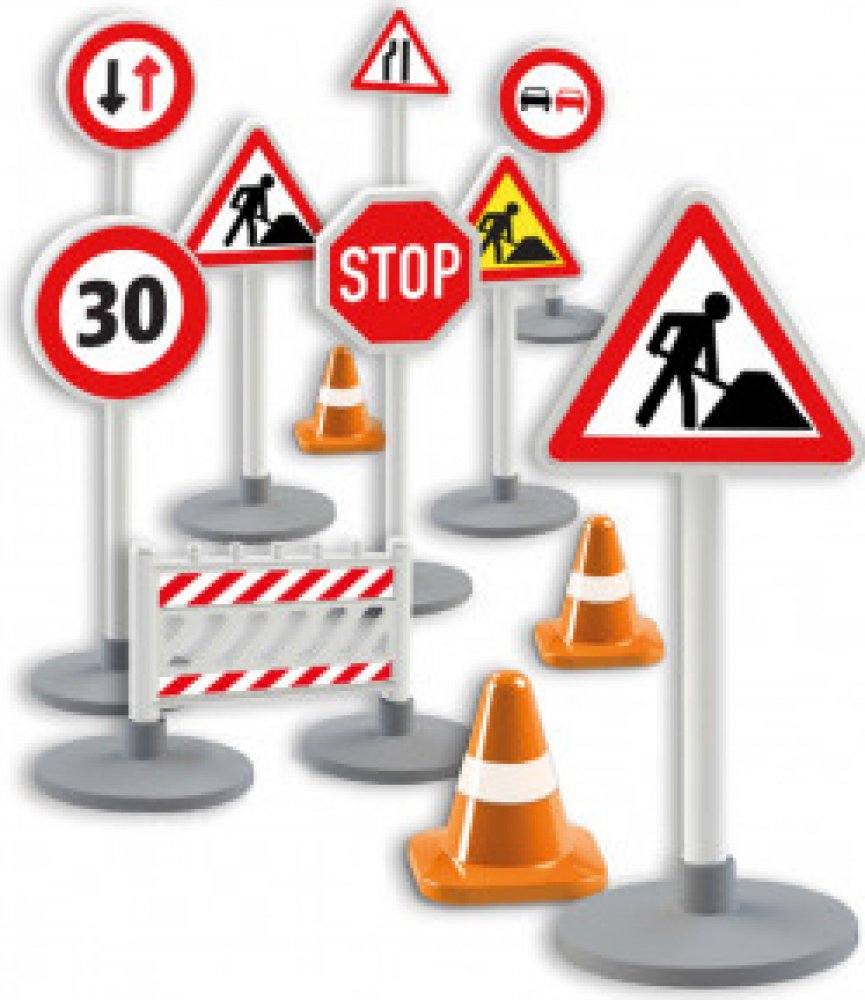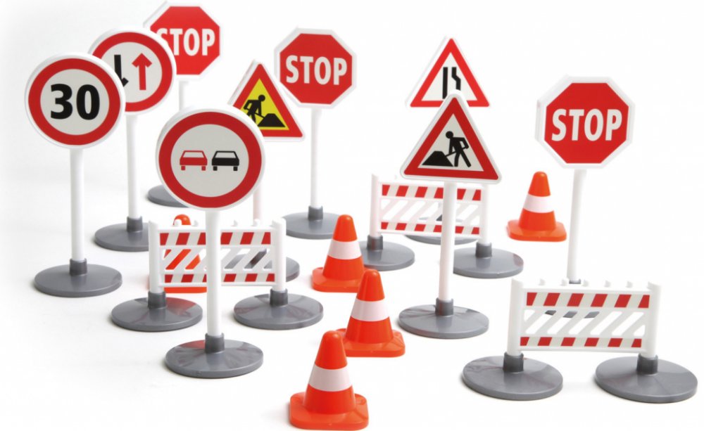 Obsah balení: 17 druhů dopravního značení (značky, polepky na značky, kužely, zábrany)