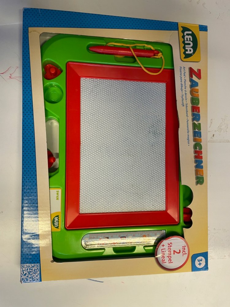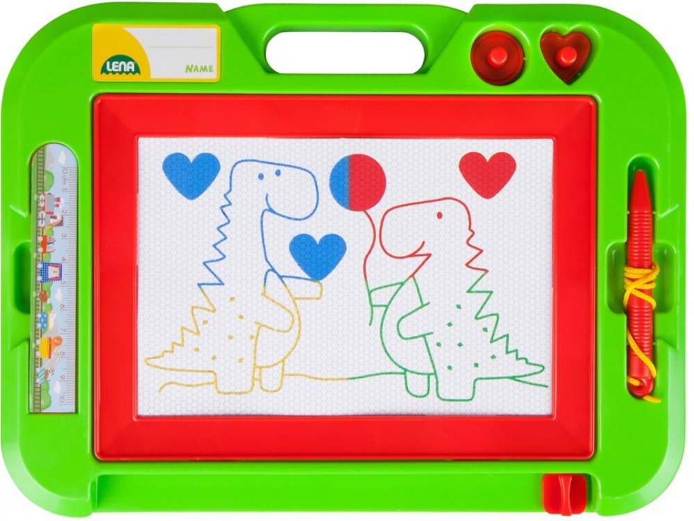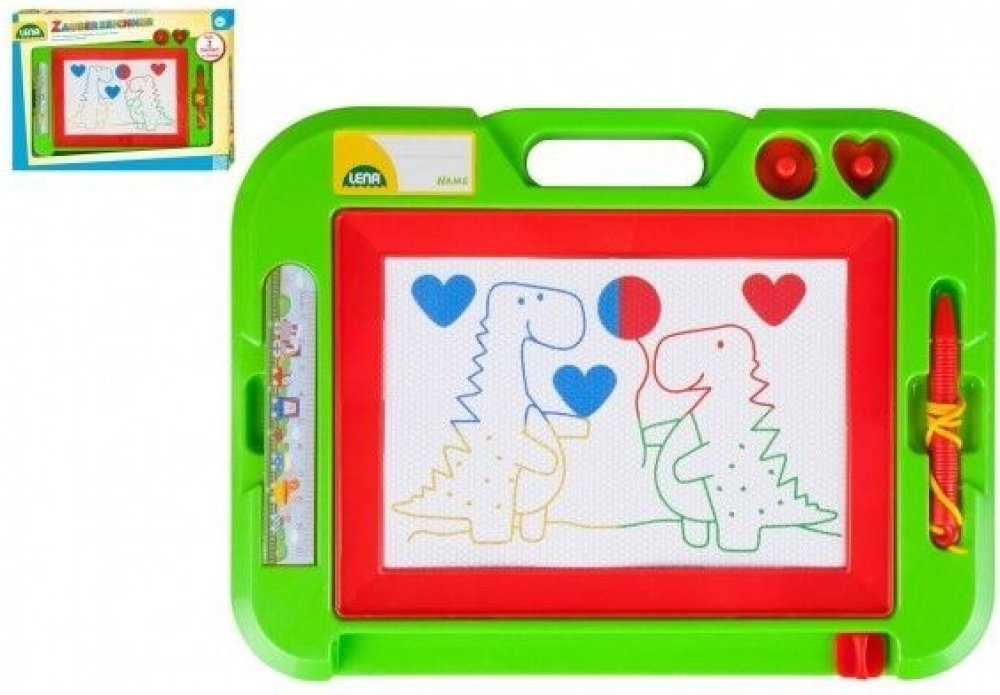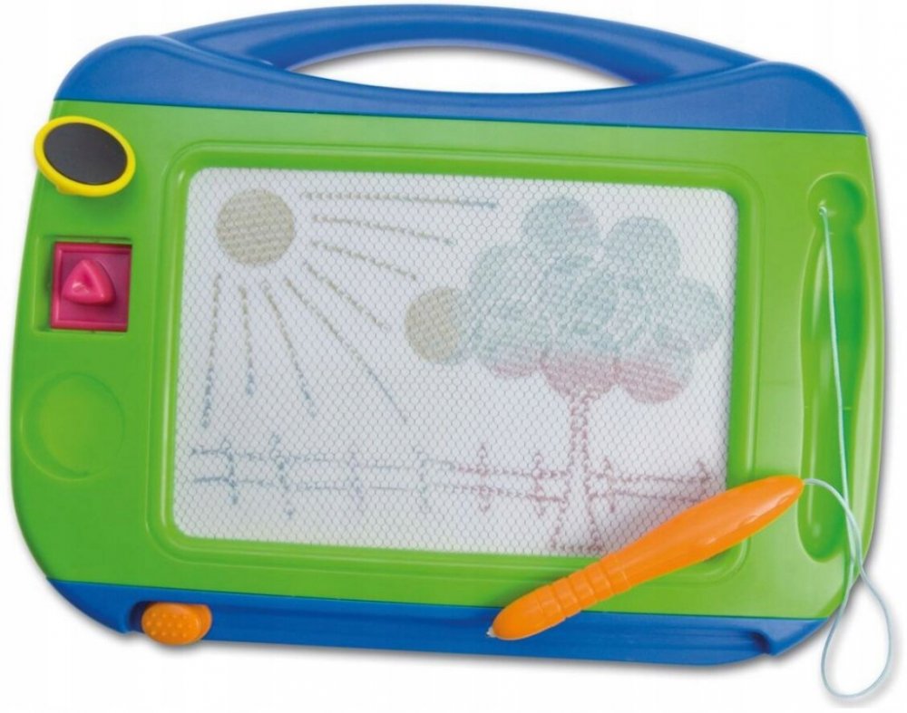 Barevná magnetická kreslící tabulka s kreslícím perem a 2 tvarovaná razítka. Posuvný zmizík vyčistí tabulku jako mávnutím kouzelného proutku. Tabulku lze přenášet díky velkému madlu.