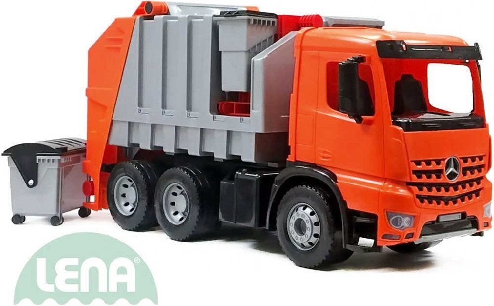Plně multifunkční popelářské auto Mercedes Arocs s odnímatelnou popelnicí a kontejnerem na kolečkách. Vyroben z kvalitního plastu. Lze použít jako odrážedlo.