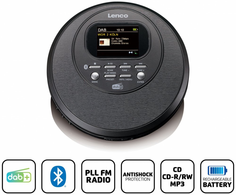 Lenco CD-500BK je kompaktní CD přehrávač, který si můžete snadno vzít kamkoliv s sebou. Zařízení lze použít k přehrávání moderních MP3 a tradičních CD. Navíc je vybaveno i Bluetooth 5.0, což Vám umožní bez námahy spárovat přehrávač s Vaším oblíbeným Bluetooth zařízením. Dále lze discman využít jako DAB+ nebo FM rádio. Uložit si můžete až 20 DAB+ a 20 FM stanic. Okamžitě pak můžete poslouchat své oblíbené kanály stiskem tlačítka. S tímto CD přehrávačem získáte zároveň i sluchátka a USB-C kabel.