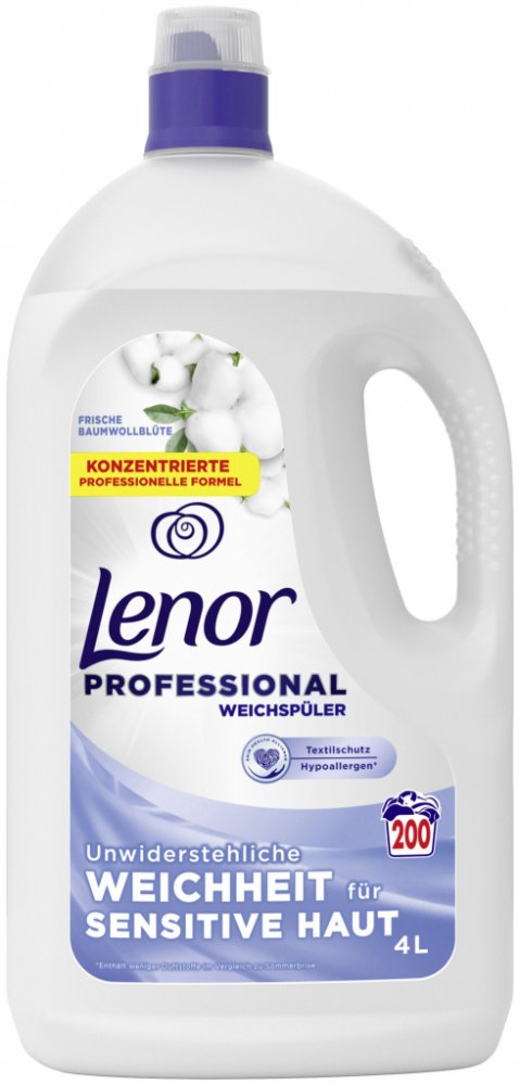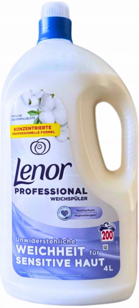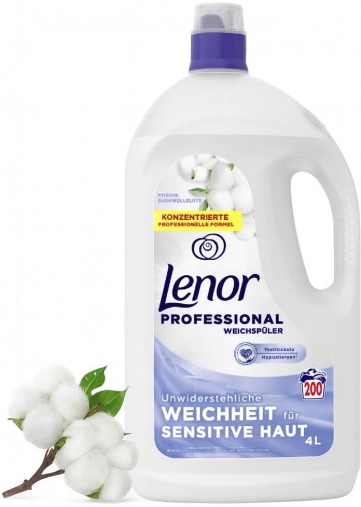 Lenor Professional Aviváž Sensitiv 200 pracích dávek 4l. Profesionální aviváž Lenor osvěží vaše prádlo, změkčí ho a ochrání vlákna díky vysoce koncentrovanému složení vyvinutému speciálně pro profesionální použití. Se svěží vůní levandule.