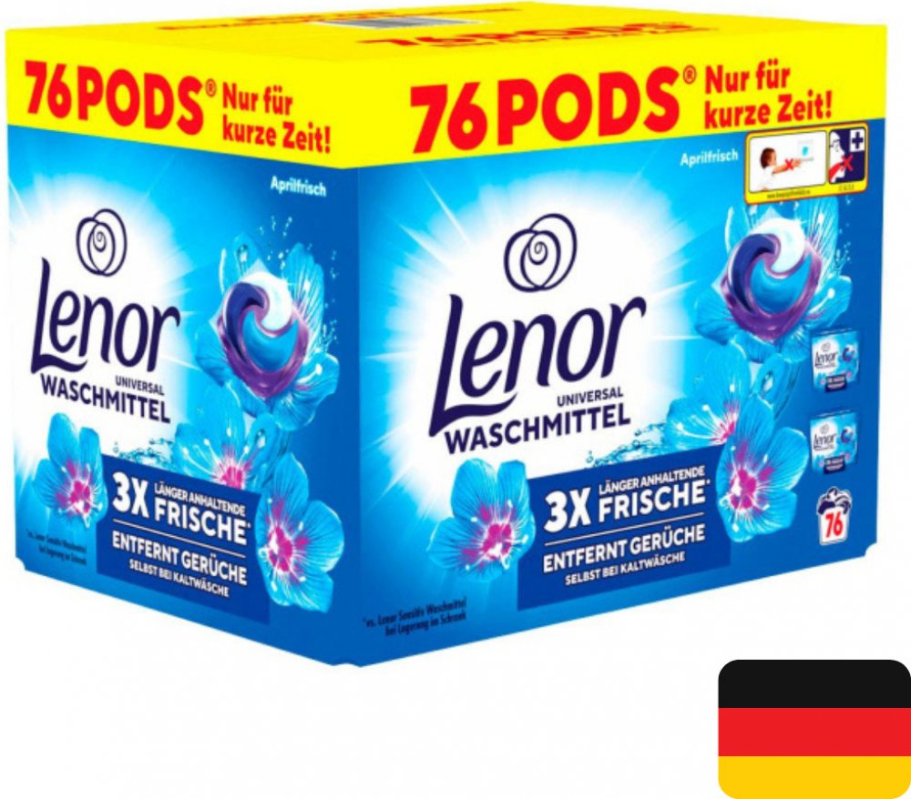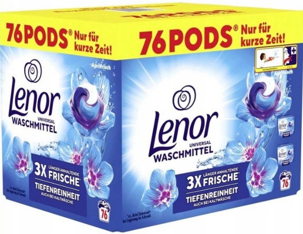 Lenor představuje kapsle na praní Aprilfrisch 5 in 1 jako záruku čistoty, vůně a hebkosti při praní vašeho prádla. All in 1 nebo-li vše v jednom: účinně odstraňují skvrny, osvěžující vůně, chrání barvy, změkčují a pečují o vlákna, eliminují nepříjemné pachy. Precizně vypere všechnu špínu a zároveň složením obsahuje složky zabraňující šednutí. Prádlo je zářivě čisté a provoněné vůní jarních květin, to vše je doplněno o vůně bílého cedru a pačule s osvěžujícími účinky. Obsah: 2 x 38 x 20,1 g = 1527,6 g. POUŽITÍ:Vložte do bubnu pračky před prádlem.SLOŽENÍ:viz Inhaltsstoffe na zadní straně obalu.UPOZORNĚNÍ:Způsobuje vážné podráždění očí. Dráždí kůži. Uchovávejte mimo dosah dětí. PŘI ZASAŽENÍ OČÍ: Několik minut opatrně vyplachujte vodou. Vyjměte kontaktní čočky, jsou-li nasazeny, a pokud je lze vyjmout snadno. Pokračujte ve vyplachování. Přetrvává-li podráždění očí: Vyhledejte lékařskou pomoc/ošetření. PŘI STYKU S KŮŽÍ: Omyjte velkým množstvím vody. PŘI POŽITÍ: Necítíte-li se dobře, volejte TOXIKOLOGICKÉ INFORMAČNÍ STŘEDISKO / lékaře. Je-li nutná lékařská pomoc, mějte po ruce obal nebo štítek výrobku. V případě nehody kontaktujte toxikologické zdravotnické zařízení. Obsahuje 4-tert-Butylcyclohexyl Acetate. Může vyvolat alergickou reakci. Skladujte na suchém místě, mimo dosah dětí.ŽIVOTNÍ PROSTŘEDÍ:Zcela prázdný a čistý plastový obal výrobku je možné recyklovat. Správným dávkováním šetříte nejen životní prostředí, ale i vaší peněženku.