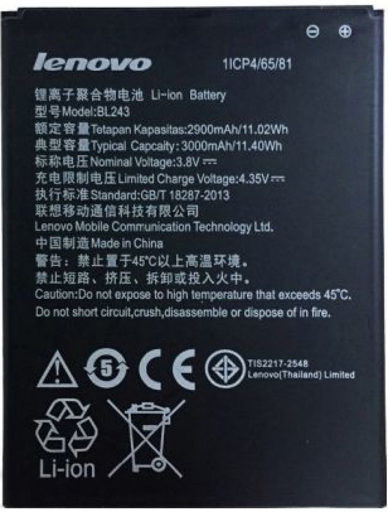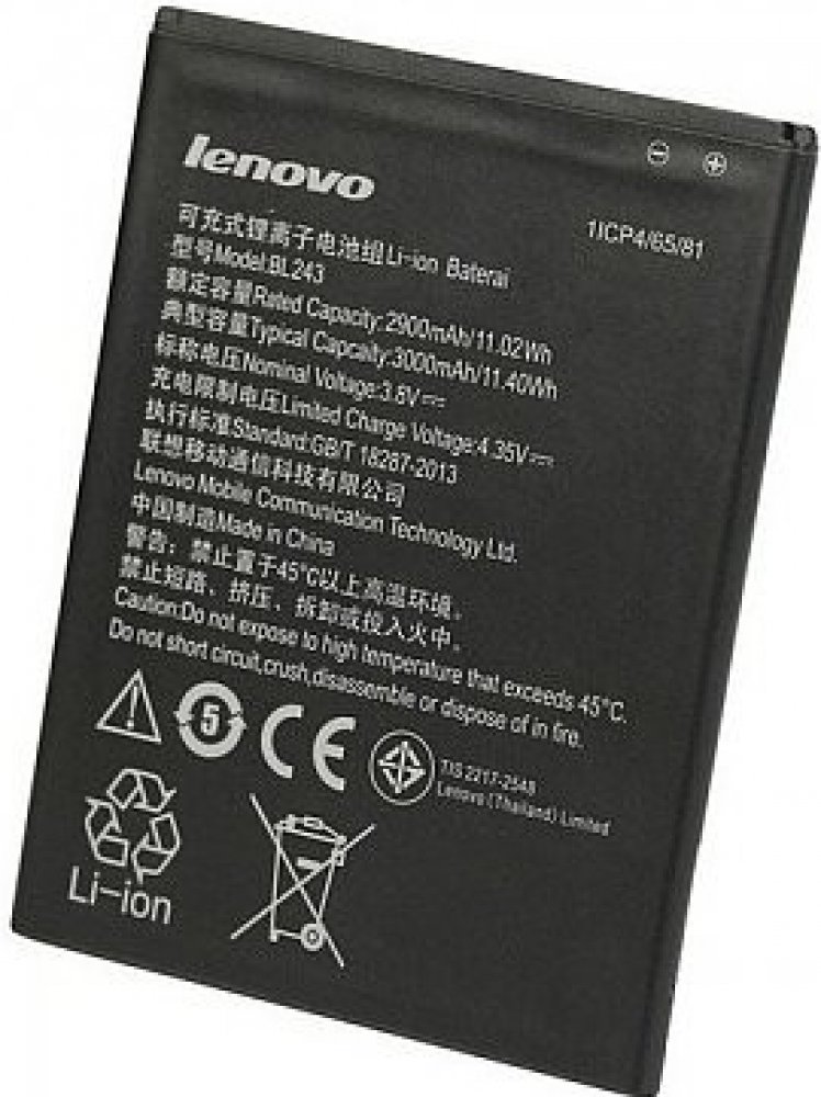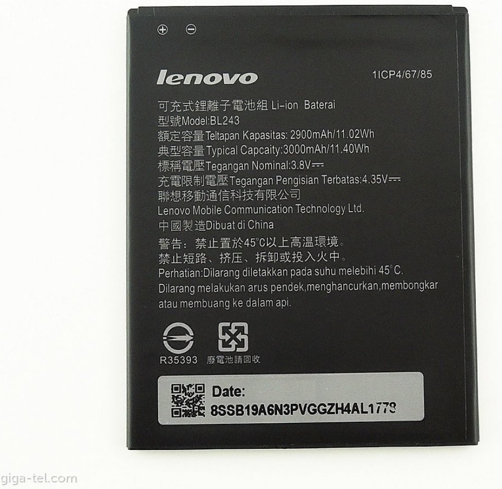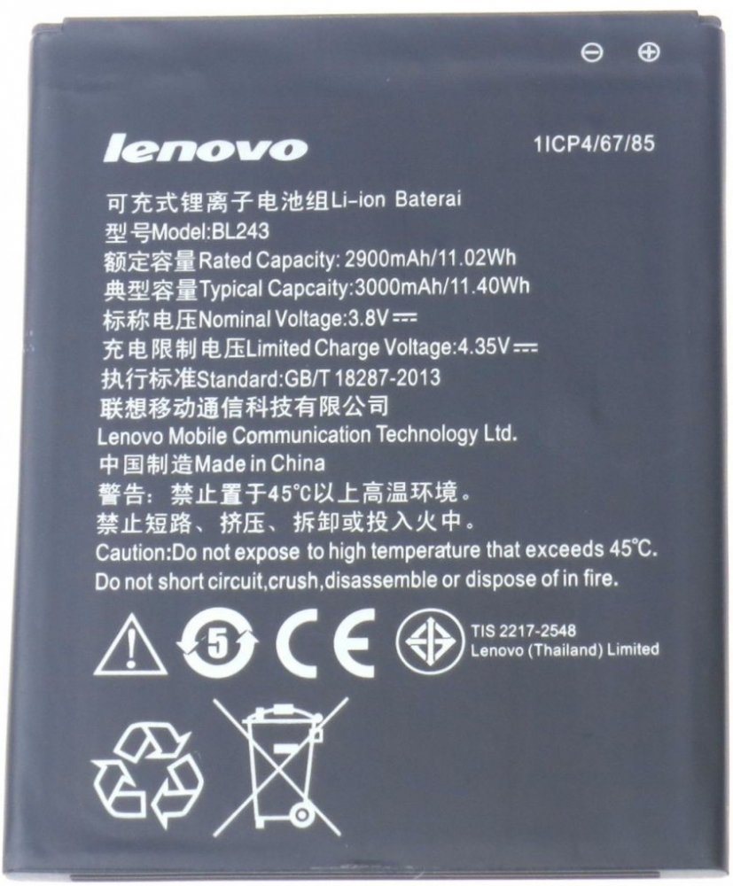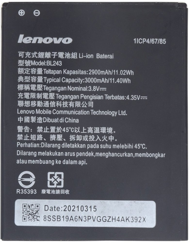 Originální baterie Lenovo BL243 s kapacitou 2900/3000mAh pro mobilní telefony Lenovo Lemon A7000 / K3 Note K50 / Lenovo Golden Warrior S8 A7600 nemá paměťový efekt a je chráněna proti přebití, přepólování a přehřátí.Baterie má vybočovací kapacitu 100 mAh.Vlastnosti baterií Li-Ion:- Nemá paměťový efekt.- Před prvním použitím baterie doporučuje baterii naformátovat - tj. 3 x plně nabít a vybít do samovolného vypnutí telefonu- Životnost až 1200 nabíjecích cyklů.- Baterii můžete dobíjet jakoukoliv nabíječkou k danému typu telefonu (originální nebo kompatibilní). Jak prodloužit životnost baterie: - Nenechávejte zbytečně dlouho plně nabité nebo úplné vybité baterie stát.- Optimálně skladujte záložní baterii v chladu a při tak 40% nabití.- Nevybíjejte do úplného vybití (tzn. když mobil nahlásí baterie vybitá, nesnažte se ji zbytečně úplně vybít)- je mnohem lepší ji dvakrát vybít na 50% než jednou na 0%.Kompatibilita: Lenovo Lemon A7000 / K3 Note K50 / Lenovo Golden Warrior S8 A7600 Co to znamená , když je ,, BULK '' balení ?Mobilní příslušenství , ale i jiné výrobky jsou většinou výrobců dodávány ve dvou typech balení. Buď klasické balení v krabici, které se označuje jako BLISTER nebo v tzv. BULK balení, tedy bez krabičky, jen v sáčku. Typ zboží je samozřejmě zcela stejný bez ohledu na druh balení, jen vychází v BULK balení levněji než v krabičce.