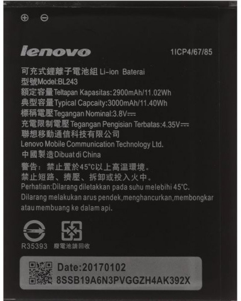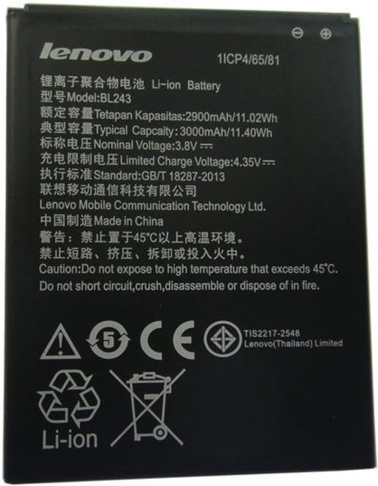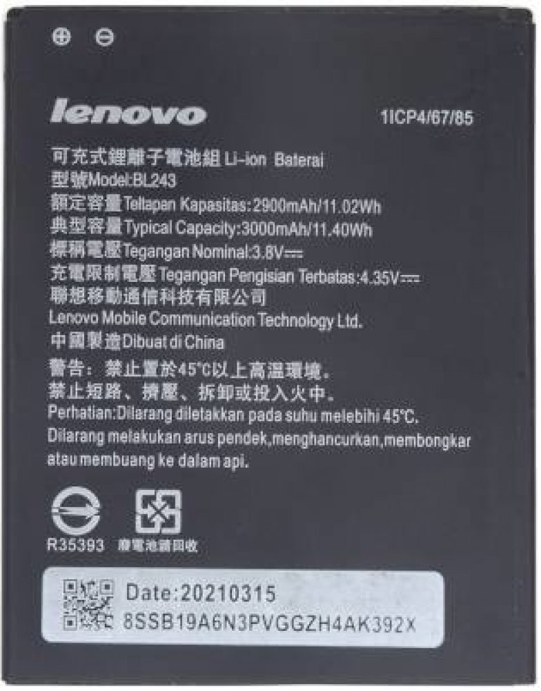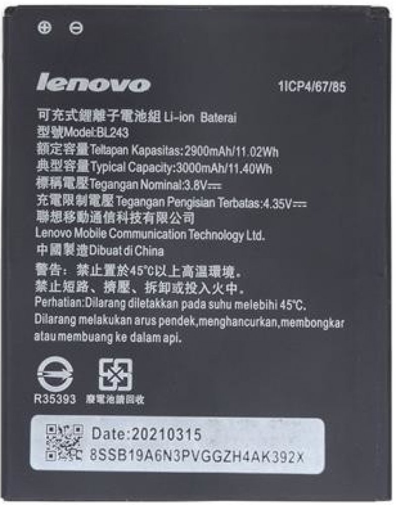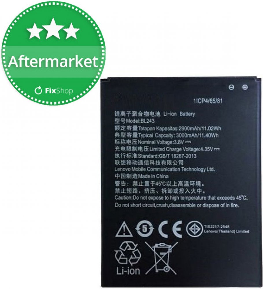 Originální baterie Lenovo BL243 s kapacitou 2900/3000mAh pro mobilní telefony Lenovo Lemon A7000 / K3 Note K50 / Lenovo Golden Warrior S8 A7600 nemá paměťový efekt a je chráněna proti přebití, přepólování a přehřátí.Baterie má vybočovací kapacitu 100 mAh.Vlastnosti baterií Li-Ion:- Nemá paměťový efekt.- Před prvním použitím baterie doporučuje baterii naformátovat - tj. 3 x plně nabít a vybít do samovolného vypnutí telefonu- Životnost až 1200 nabíjecích cyklů.- Baterii můžete dobíjet jakoukoliv nabíječkou k danému typu telefonu (originální nebo kompatibilní). Jak prodloužit životnost baterie: - Nenechávejte zbytečně dlouho plně nabité nebo úplné vybité baterie stát.- Optimálně skladujte záložní baterii v chladu a při tak 40% nabití.- Nevybíjejte do úplného vybití (tzn. když mobil nahlásí baterie vybitá, nesnažte se ji zbytečně úplně vybít)- je mnohem lepší ji dvakrát vybít na 50% než jednou na 0%.Kompatibilita: Lenovo Lemon A7000 / K3 Note K50 / Lenovo Golden Warrior S8 A7600 Co to znamená , když je ,, BULK '' balení ?Mobilní příslušenství , ale i jiné výrobky jsou většinou výrobců dodávány ve dvou typech balení. Buď klasické balení v krabici, které se označuje jako BLISTER nebo v tzv. BULK balení, tedy bez krabičky, jen v sáčku. Typ zboží je samozřejmě zcela stejný bez ohledu na druh balení, jen vychází v BULK balení levněji než v krabičce.