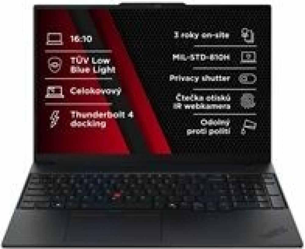 Správa zabezpečení: discrete TPM 2.0 enabled, bezpečnostní slot Kensington® Nano (2,5x6mm), IR kamera pro Windows® Hello (rozpoznávání obličeje), závěrka fotoaparátu, čtečka otisku prstů, ThinkShield