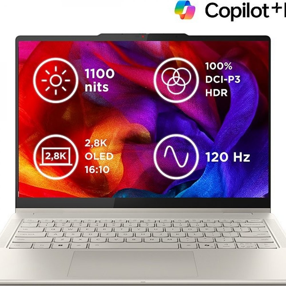 4.5 GHz Intel Core Ultra 5 8 16 GB LPDDR5x 0 1024 GB 1000 GB M.2 velmi rychlé NVMe 1× slot 14 palce 2880 x 1800 OLED 120 Hz 16 : 10 lesklý displej 500 nitů excelentní/profesionální ne, slyšitelný ventilátor HD kvalita (1080p) Intel Arc 130V integrovaná karta WiFi 7 Bluetooth 5.4 1.38 kg 317 mm 228 mm 228 mm recyklovaný hliník béžové Windows 11 Home Lenovo Lenovo Yoga 2023 13.5 hodin 70 Wh 65 W celodenní výdrž 0 1 0 2 3 český Podsvícená, kompaktní výkonný notebook Intel AI Boost Copilot+ PC (40+ TOPS)
