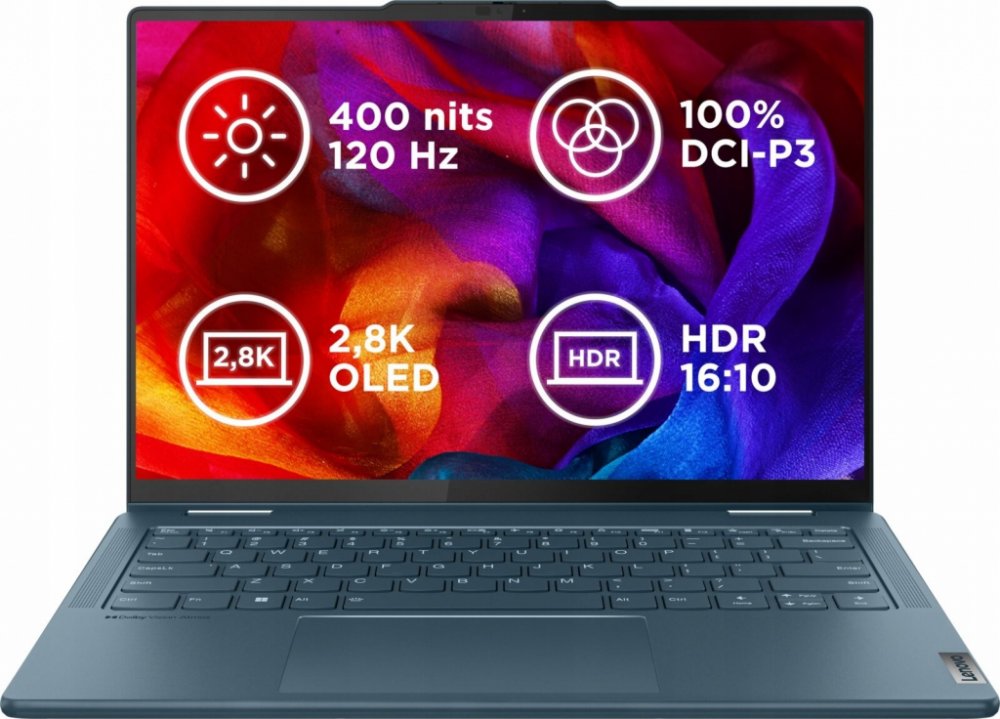 Displej: OLED, 14" 2,8K (2880x1800), skleněný, lesklý, anti-fingerprint, 400 nitů, 120Hz, 16:10, 100.000:1, 100% DCI-P3, 4x 85° pozorovací úhly, Dolby Vision, DisplayHDR True Black 500, TÜV Low Blue Light (HW)