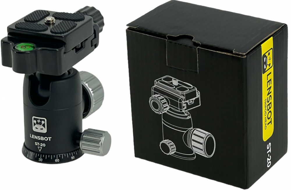 LENSBOT ST-20 je profesionální kulová hlava s nosností až 6kg. Zespoda má 3/8" závit, díky kterému hlavu jednoduše nasadíte na foto stativ, jeřáb, car mount a další filmové příslušenství. Hlava obsahuje upínací systém Arca Swiss. Obsahuje dvě vodováhy a 360° rotační panaramatickou osu ovládáte velice plynule.Hmotnost samotné hlavičky je navíc pouhých 250g, což při její nosnosti je skvělý poměr.