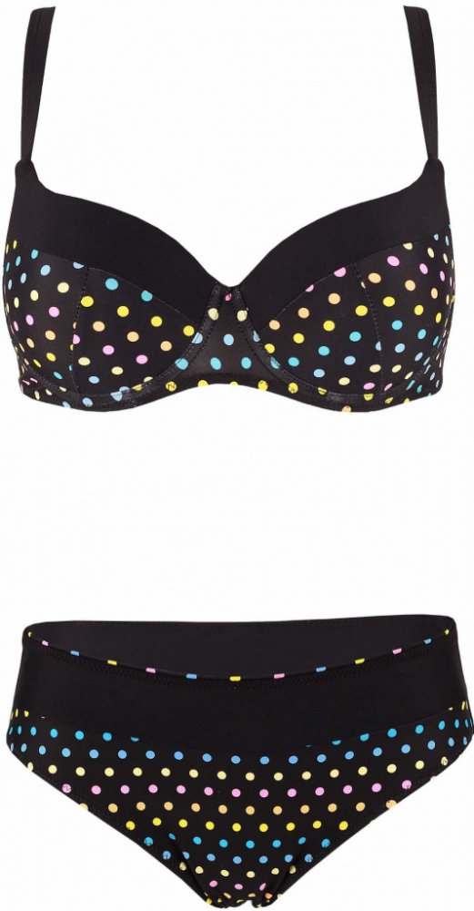 Leona jsou pohodlné dvoudílné dámské plavky. Klasický střih kalhotek vás nikde nebude tlačit a pěkně obemkne vaši postavu. Horní díl Pevná, středně tenká, rovnoměrná výztuž Košíčky jsou tvarované dokulata a mají všité kostice Jednobarevný podklad s potiskem barevných puntíků Střed o výšce přibližně 5 cm Ramínka pevně přišitá, délkově nastavitelná, šířka 1,6 cm Zadní zapínání je na plastovou sponu ...