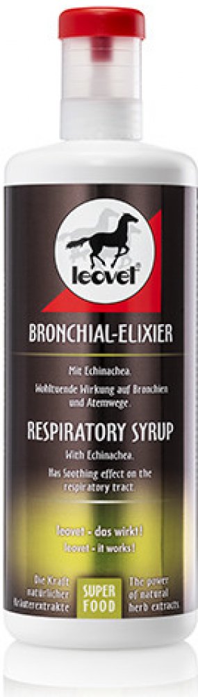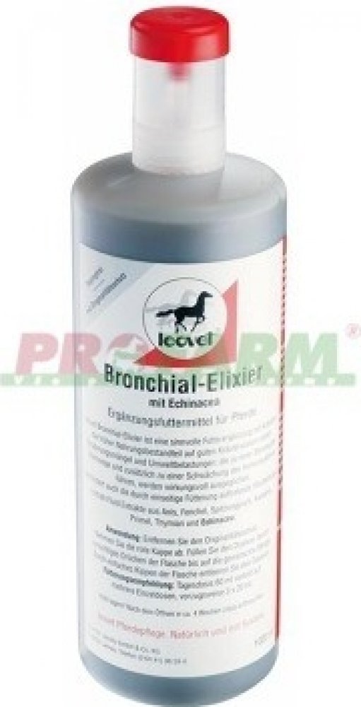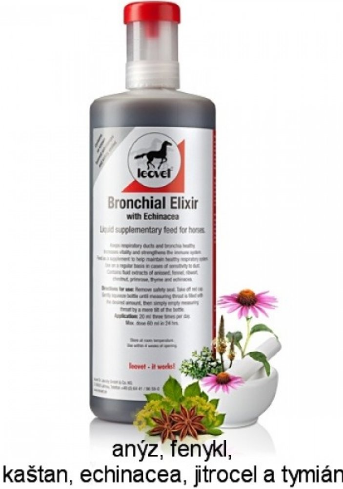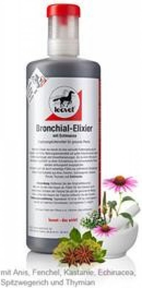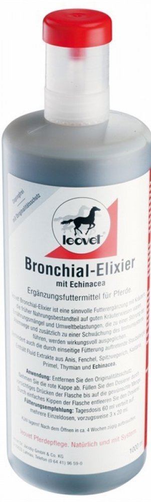 Průduškový elixír LEOVET Bronchial s echinaceou 1000 ml - je výrazným pomocníkem pro pomoc koním s dýchacími problémy. Obsahuje anýz, fenykl, jitrocel kopinatý, kaštan, prvosenku jarní, tymián, echinaceu. Tyto bylinny jsou vhodné pro léčbu dýchacích cest a průdušek koně. Podporuje uvolňování hlenů v dýchacích cestách. Celkové působí velice příznivě na regeneraci dýchacích cest a průdušek koní.