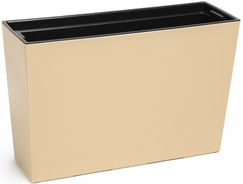 Plastový truhlík s lesklým povrchem. Součástí každého truhlíku je vyjímatejná plastová vložka s oušky pro snadnou malipulaci a knoty. Do plastové vložky se sadí květiny. Přebytečná voda je zachytávaná