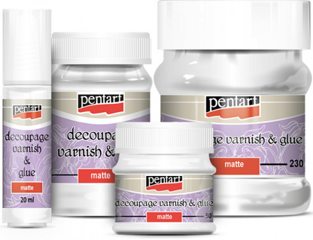 Lepidlo a lak na decoupage matné - různé objemy Lak a lepidlo na decoupage v jednom. Je vyrobené na vodní bázi. Lepidlo je přilnavé na různé druhy povrchů: kov, sklo, dřevo, keramika, papír nebo textil (určený pro ruční praní). Speciálně se doporučuje pro lepení ubrousků, ubrousků nebo dekoračních papírů. Lak dodává dekorovanému předmětu matný vzhled. Použití: Oddělte například z třívrstvé servítky vrchní vrstvu a umístěte na předmět, který chcete zdobit. Následně přetřete lepidlem a nechte uschnout.