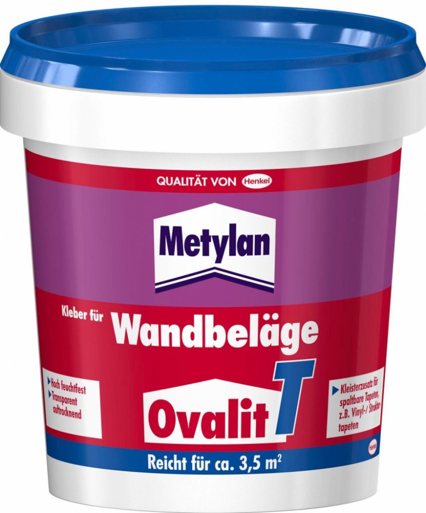Lepidlo na obklady stěn pro optimalizaci lepivosti. Jako zesilovač lepivosti: 1. optimalizuje lepivost u tapet s problematickou strukturou a vinylových tapet, 2. je ideální k lepení tapet se zadní vrstvou z papíru a 3. zlepšuje odolnost tapet proti vlhkosti v kuchyni a koupelně Metylan Ovalit T lepí: 1. textilní tapety a textilní obklady stěn, 2. PVC fólie s textilní zadní stranou a 3. kovové tape...