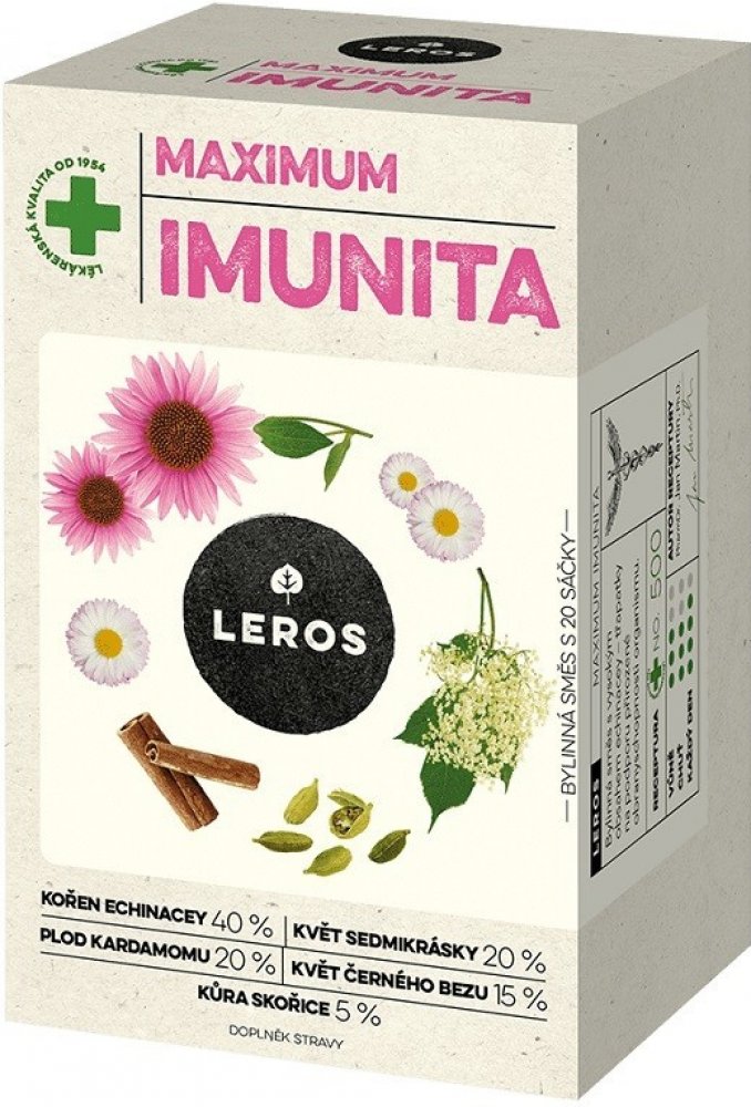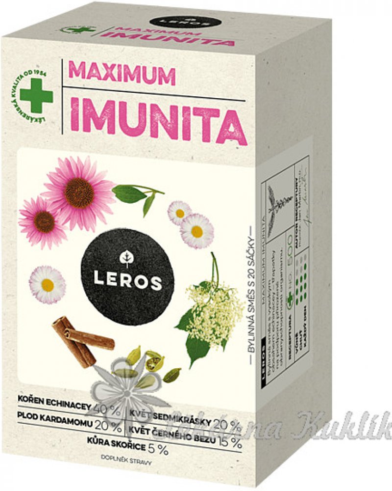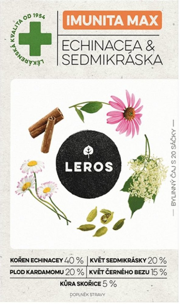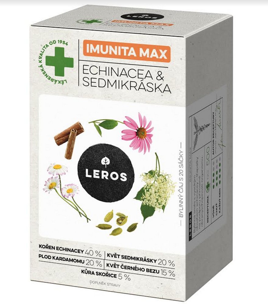 Kvalitní LEROS ImunitaMAX Echinacea Sedmikráska n.s.20x1.2g za 62.1 Kč. SLOŽENÍ: Kořen echinacey (40 %), Květ sedmikrásky (20 %), Plod kardamomu (20 %), Květ černého bezu (15 %), Kůra skořice (5 %)