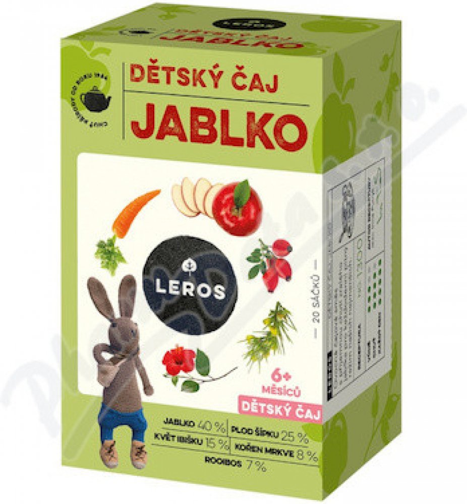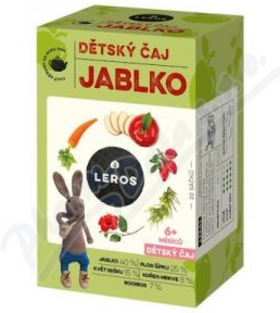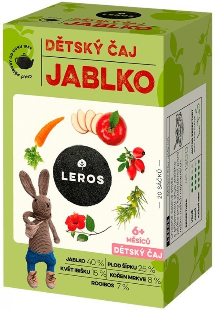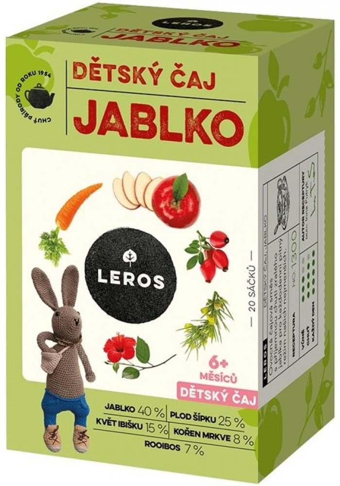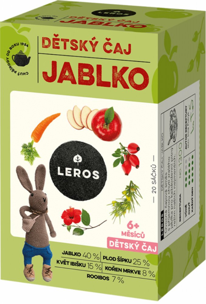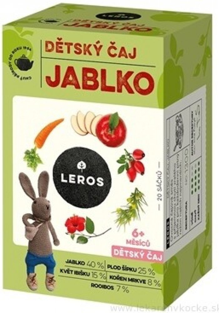 LEROS Dětský čaj Jablko je ovocná čajová směs vonící po sladkých jablíčkách, která je chutným doplňkem dětského pitného režimu. Jemný čaj z jablek, šípků, ibišku, mrkve a rooibosu chutná dětem i dospělým. Čaj nádherně voní a chutná po šťavnatých jablkách. Ovocnou chuť nápoje podpoří i oplodí šípku, květ ibišku dodá kyselkavý přídech i načervenalý odstín zrajících jablek. V parném létě ho můžete vyzkoušet i chlazený.
