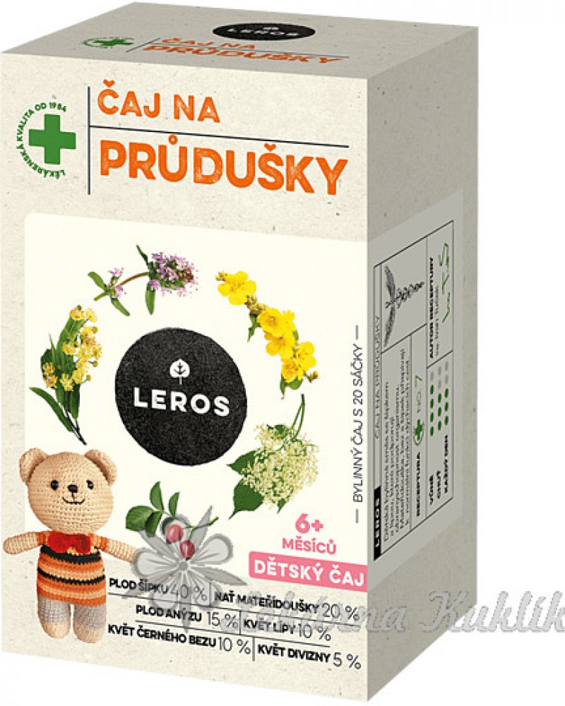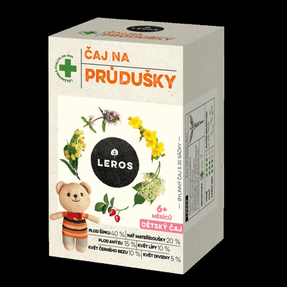 Leros Dětský čaj na průdušky je bylinná směs se šípkem, lípou, mateřídouškou, černým bezem. Bylinná směs je vhodná k doplnění pitného režimu dětí, zvláště v období podzimních plískanic. Ovocná chuť šípků výtečně ladí s lehounce kořenitou chutí mateřídoušky a nasládlou chutí lípy. Čaj zlatavé barvy krásně voní po anýzu, výraznou příjemnou vůni mu dodává i mateřídouška.
