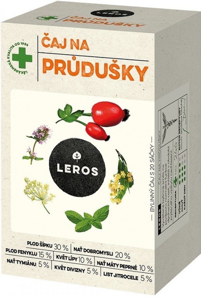 Leros Čaj na průdušky je vyvážená bylinná směs se šípkem, dobromyslí, fenyklem, lípou, mátou, jitrocelem, tymiánem a diviznou. Bylinková směs má lahodnou, přirozeně nasládlou chuť, kterou jí dodává především fenykl a lípa. O příjemnou svěžest se postará šípek. Čaj kaštanové barvy voní po dobromysli, jejíž vůni zná každý, kdo v kuchyni používá oregano, ale také po mátě, lipovém květu a tymiánu.