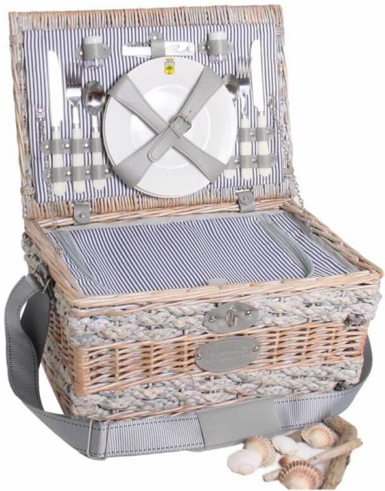 Elegantní piknikový koš s motivem lanoví. To je v barvě přírodní "špinavě" bílé. Nechybí popruh přes rameno pro pohodlné přenášení. Celý vnitřní prostor koše je tvořen termo prostorem a textilií v námořnické modrobílé barvě.