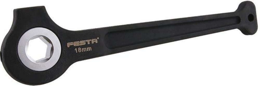 Lešenářská ráčna FESTA 18 mm je klíč - ráčna k trubkovému lešení. Tradiční lešenářská ráčna s vnitřní rohatkou, která obsahuje jen 6 velkých zubů. Díky tomu je mechanismus velmi odolný stejně, jako celá ráčna, kterou často používají i jako kladivo. Hmotnost 0,840 kg.