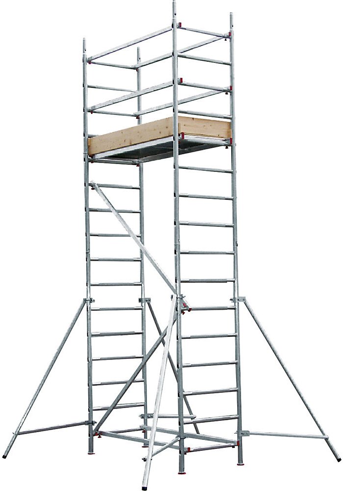 Modulové lešení AL 700, plošina d x š 1,58 x 0,61 m, modul 1+2. Dodávka = rozebráno. Šířka plošiny = 0,61 m. Výška plošiny = 2,95 m. Délka plošiny = 1.58 m. Pracovní výška = 4.95 m. Výška stání = 2.95 m. Výška lešení = 4.15 m. Hmotnost = 48.2 kg. Materiál = hliník. Šířka lešení = 0.72 m. Norma = DIN EN 1004. Typ produktu = modulární lešení. Kompaktní - nízká potřeba místa při skladování a přepravě. Rychlá montáž a demontáž díky zaskakovacím uzávěrům na výztuhách a diagonálách. Lehké, flexibilní stacionární lešení vybavené talířovými nohami. S otočnými koly (příslušenství) lze používat také jako pojízdné lešení. Prostorné díky plošině o délce 1,58 m. Velká pracovní plocha díky šířce částí rámu 0,72 m. Splňuje normu EN 1004 (třída 3). Přípustné zatížení 200 kg/m² (2,0 kN/m²). Dodržujte návod k montáži a použití, ve kterém najdete potřebný počet přídavných dílů pro připevnění na stěnu nebo protizávaží.