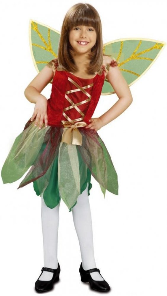 Krátké šaty s vrstvenou zelenou sukní, která tvoří dojem listů. Vrchní díl je červený sametový se zlatou šněrovačkou. V pase je velká zlatá mašle. Živůtek je na ramínka, která jsou nařasená z průhledné červené, zelené a krémové látky. Ke kostýmu patří zelená křídla se zlatými stužkami vytvářející listy.
