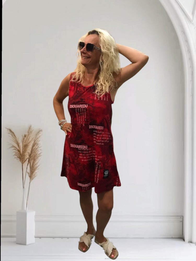 Tyto stylové šaty bez rukávů s kulatým výstřihem jsou skvělou volbou pro ty, kteří se nebojí vystoupit z davu. Originální potisk s nápisy a abstraktními vzory dodává šatům moderní a odvážný vzhled. Jsou vyrobeny z materiálu, který se skládá z 95 % bavlny a 5 % elastanu, což zajišťuje pohodlí a lehkost. Ideální na každodenní nošení i na speciální příležitosti, kde chcete zazářit.
