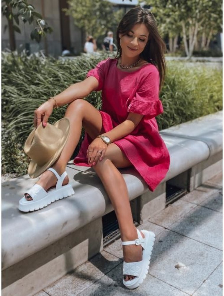 Dámské mušelínové šaty v růžové barvě s krátkým rukávem, vyrobeno z vysoce kvalitního materiálu a navrženo podle nejnovějších módních trendů.