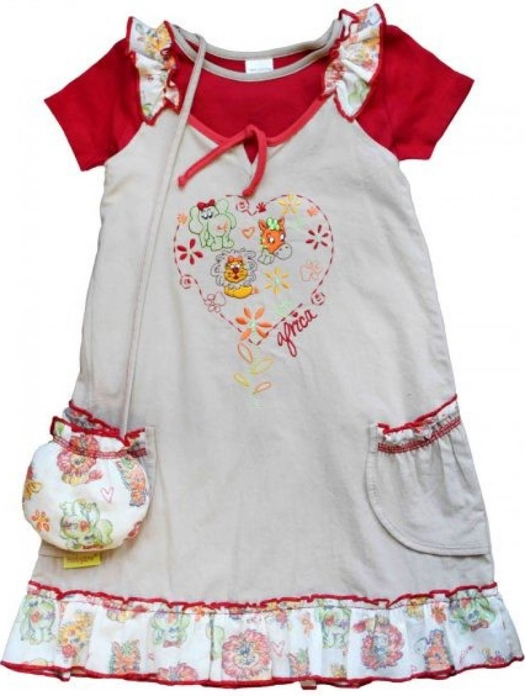 Letní komplet trička, šatové sukýnky a kabelky je přesně tím pravým pro ty, kteří chtějí něco trochu jiného nebo shánějí originální dárek. Kontrastní tričko výrazné barvy dokonale ladí s šatovkou. Šatovka má nařasená širší ramínka, dvě kapsičky, a spodní okraj s volánkem. Zdobí ji vyšitá aplikace afrických zvířátek v srdíčku a mašlička. Součástí setu je i kabelka, která má stejný potisk jako volán...