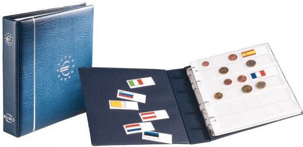 Album na mince z kvalitní modré koženky, čtyřkroužkovou mechanikou a 7 listy NUMIS 338425 (na 21 kompletních sad Euro mincí) + barevné vlajky s možností popisu (27 zemí) + bílé mezilisty.