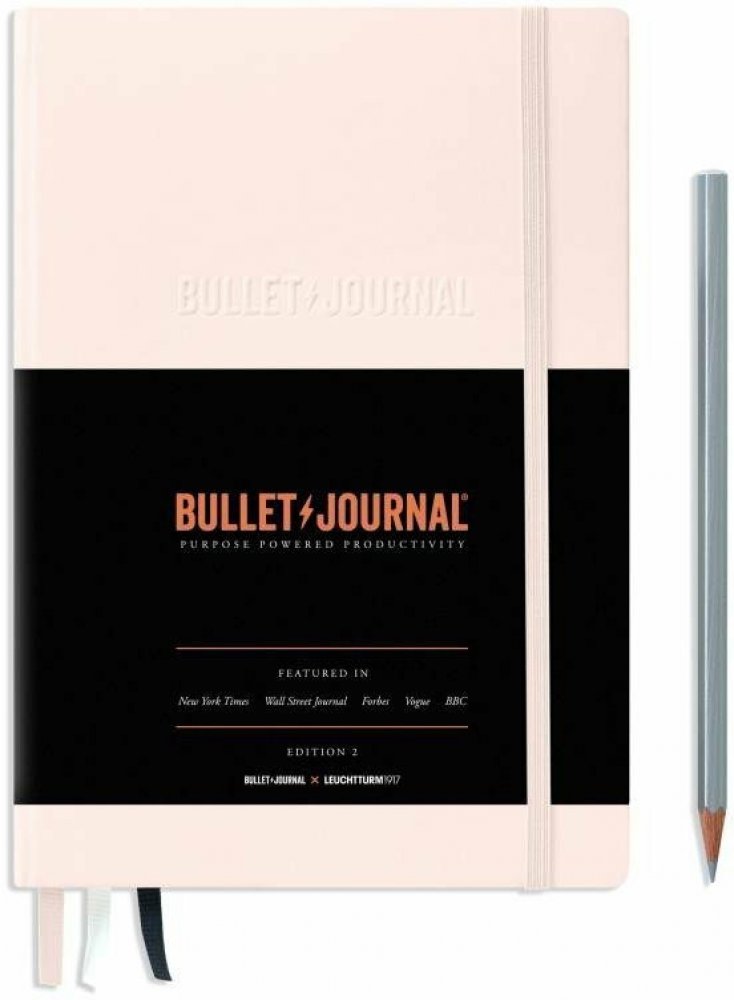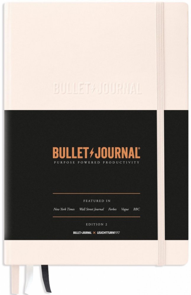 Bullet Journal® – Edition 2. Detaily: • Papír 120 g/m2 • Rozdělovač stránek pro rychlé seskupování stránek • Odnímatelná kapesní příručka Bullet Journal® v angličtině • Vodící mřížka na vnitřní straně obálky • Sada samolepek zobrazujících dny v týdnu, měsíce a mnoho dalšího... • Tečkované stránky • Tři látkové záložky • Rejstřík, Future Log a 206 číslovaných stránek • Elastický pásek k uzavření zápisníku • Zadní kapsa na drobnosti, volné listy, poznámkové bloky nebo karty • Šitá vazba • Barva obálky: Black, Blush, Blue22 nebo Green23 se slepou ražbou loga „Bullet Journal“ Formát • Medium (A5) 145 x 210 mm; Pevná vazba