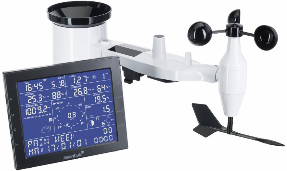 ZnačkaLevenhuk, Inc., USAZáruka, rokyživotnostEAN5905555017860Velikost balení (DxŠxV), cm44x26x16.5Přepravní hmotnost, kg1.9Rozsah měření300–1100 hPaRozlišení měření0,1Přesnost měření±3 hPa (při tlaku nižším než 700–1100 hPa)Rozsah měření10% až 99%Rozlišení měření1%Přesnost měření±5%Rozsah měření uvnitř0...+50 °CRozsah měření ve vnějším prostředí-40...+60 °CRozlišení měření0.1 °CPřesnost měření±1 °CHodinyyesKalendářyesBudíkyesRozsah měřeníod 0 do 50 m/sPřesnost měření±1 m/s (pro rychlost větru 5 m/s)Rozsah měření0 až 9999 mmRozlišení měření0,3 mm (pro srážky 1000 mm)Přesnost měření±10 %Počet obrazovek1Interval mezi indikacemi48 s (uvnitř), 16 s (venku)Frekvence rádiového signálu, MHz433Poloměr rádiového signálu, m100Cyklus přenosu dat1–240 min. (přizpůsobitelný)Wi-FiyesSpecifikace vodotěsnostiIPX3, ochrana proti svislému postříkání vodouPočet připojených externích snímačůaž 8 ks (1 ks je součástí balíčku)Je k dispozici trend vývoje počasíyesBezdrátový snímačyesPodsvíceníyesUmístěníuvnitř, venkovní prostředíTypmeteorologická staniceVestavěné funkceteploměr, barometr, vlhkoměr, srážkoměr, anemometr, hodiny, budík, kalendářDesignbezdrátový, digitální, nástěnný, stolníMožnosti použitípro profesionální použitíJednotky měřenímmHg, inHg, hPaSpeciální vlastnostidetekování minimální a maximální hodnoty, upozornění na vysoký nebo nízký tlak, graf změn, historie denních hodnotJednotky měření% (RH – relativní vlhkost)Speciální vlastnostiupozornění na nízkou/vysokou vlhkostJednotky měření°C, °FSpeciální vlastnostihistorie měření, upozornění na nízkou/vysokou teplotuČasový formát12 hodin, 24 hodinSpeciální vlastnostifáze Měsíce na severní a jižní polokouliJednotky měřenímph, m/s, km/h, uzlySpeciální vlastnostipaměť pro maximální rychlosti větru, paměť pro maximální rychlosti nárazového větru, upozornění na nárazový vítr, Beaufortova stupniceJednotky měřenímm, palceSpeciální vlastnostiukládání údajů za 1 hod. / 24 hod. / týden / měsíc / celkem, ukládání maximálních hodnotTyp obrazovkyčernobílýFunkce obrazovkysegmentovanéNapájenísolární baterie, baterie AA (1,5 V) (nejsou součástí balíčku): meteorologická stanice – 3 ks., venkovní senzor – 2 ks., 5 V z AC síťového zdrojeTěloplastDalší vlastnostirosný bod, upozornění na slabou baterii, tepelný index, UV index, úroveň osvětlení (0–200 klx)