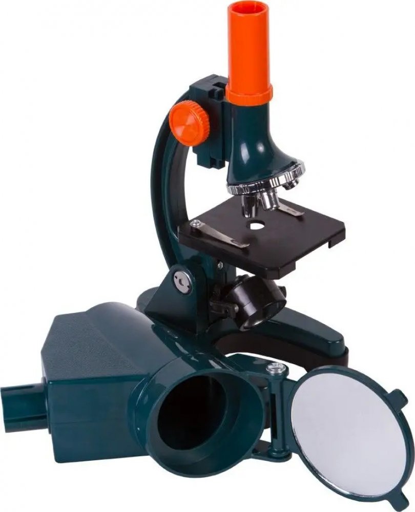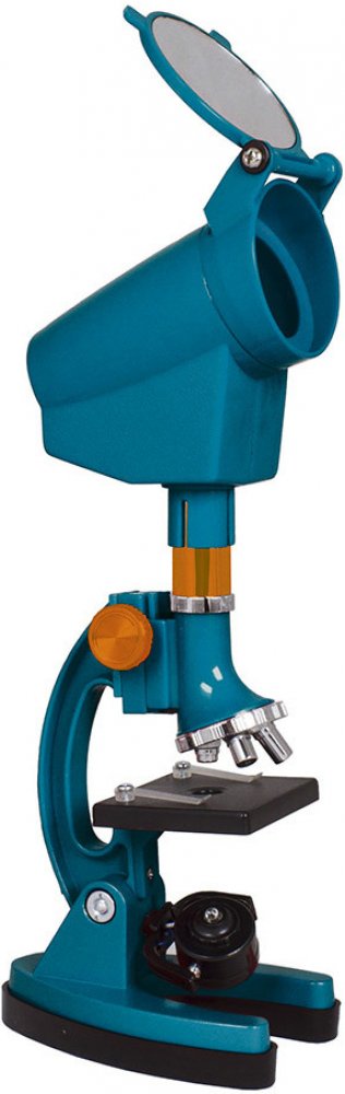 Světelný zdroj se nachází pod stolkem. Můžete si vybrat mezi zrcátkem a zabudovaným osvětlovacím tělesem. Osvětlení je napájeno bateriemi (nejsou součástí sady). Tělo mikroskopu je vyrobeno z kovu. Sada obsahuje praktický plastový kufřík k ukládání mikroskopu i veškerého dodaného příslušenství.